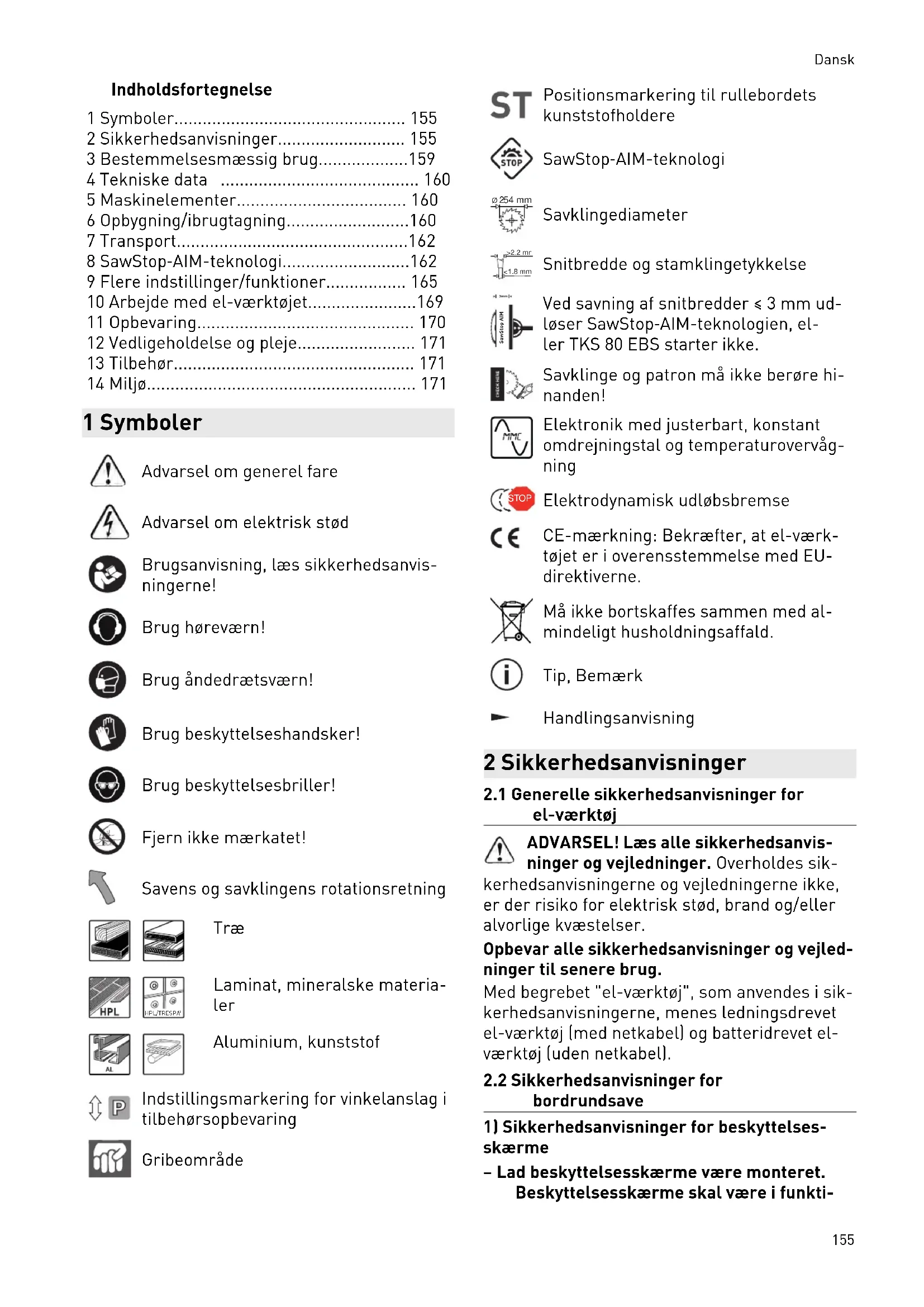 Snitbredde og stamklingetykkelse 3mm SawStop AIM Ved savning af snitbredder ≤ 3 mm ud løser SawStop‑AIM-teknologien, el ler TKS 80 EBS starter ikke. Savklinge og patron må ikke berøre hi nanden! Elektronik med justerbart, konstant omdrejningstal og temperaturovervåg ning STOP Elektrodynamisk udløbsbremse CE-mærkning: Bekræfter, at el-værk tøjet er i overensstemmelse med EU- direktiverne. Må ikke bortskaffes sammen med al mindeligt husholdningsaffald. Tip, Bemærk Handlingsanvisning 2 Sikkerhedsanvisninger