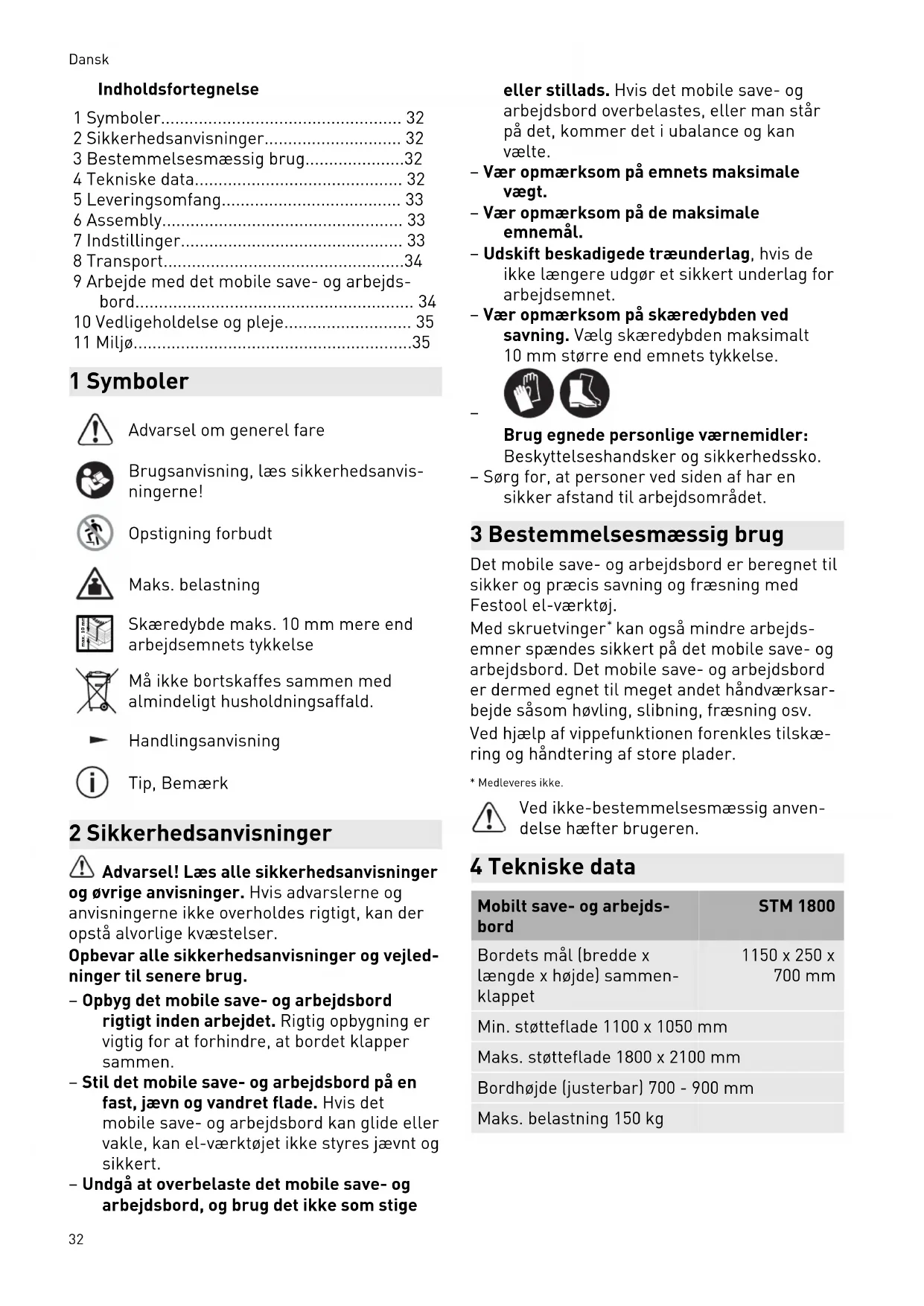 - 11 Miljø 1 Symboler Advarsel om generel fare Brugsanvisning, læs sikkerhedsanvis ningerne! Opstigning forbudt Maks. belastning max. 10 mm Skæredybde maks. 10 mm mere end arbejdsemnets tykkelse Må ikke bortskaffes sammen med almindeligt husholdningsaffald. Handlingsanvisning Tip, Bemærk 2 Sikkerhedsanvisninger Advarsel! Læs alle sikkerhedsanvisninger og øvrige anvisninger. Hvis advarslerne og anvisningerne ikke overholdes rigtigt, kan der opstå alvorlige kvæstelser. Opbevar alle sikkerhedsanvisninger og vejled ninger til senere brug. – Opbyg det mobile save- og arbejdsbord rigtigt inden arbejdet. Rigtig opbygning er vigtig for at forhindre, at bordet klapper sammen. – Stil det mobile save- og arbejdsbord på en fast, jævn og vandret flade. Hvis det mobile save- og arbejdsbord kan glide eller vakle, kan el-værktøjet ikke styres jævnt og sikkert. – Undgå at overbelaste det mobile save- og arbejdsbord, og brug det ikke som stige eller stillads. Hvis det mobile save- og arbejdsbord overbelastes, eller man står på det, kommer det i ubalance og kan vælte. – Vær opmærksom på emnets maksimale vægt. – Vær opmærksom på de maksimale emnemål. – Udskift beskadigede træunderlag, hvis de ikke længere udgør et sikkert underlag for arbejdsemnet. – Vær opmærksom på skæredybden ved savning. Vælg skæredybden maksimalt 10 mm større end emnets tykkelse. p. 35