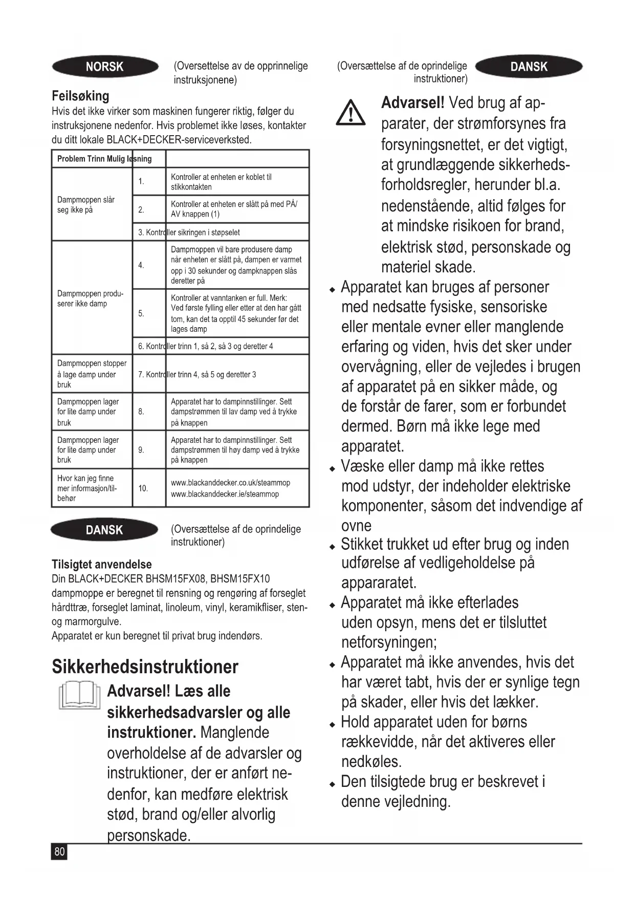 Apparatet har to dampinnstillinger. Sett dampstrømmen til høy damp ved å trykke på knappenHvor kan jeg nne mer informasjon/til-behør www.blackanddecker.co.uk/steammop www.blackanddecker.ie/steammop(Oversættelse af de oprindelige instruktioner) DANSK Tilsigtet anvendelse Din BLACK+DECKER BHSM15FX08, BHSM15FX10 dampmoppe er beregnet til rensning og rengøring af forseglet hårdttræ, forseglet laminat, linoleum, vinyl, keramikiser, sten- og marmorgulve.Apparatet er kun beregnet til privat brug indendørs. Sikkerhedsinstruktioner Advarsel! Læs alle sikkerhedsadvarsler og alle instruktioner. Manglende overholdelse af de advarsler og instruktioner, der er anført ne- denfor, kan medføre elektrisk stød, brand og/eller alvorlig personskade.