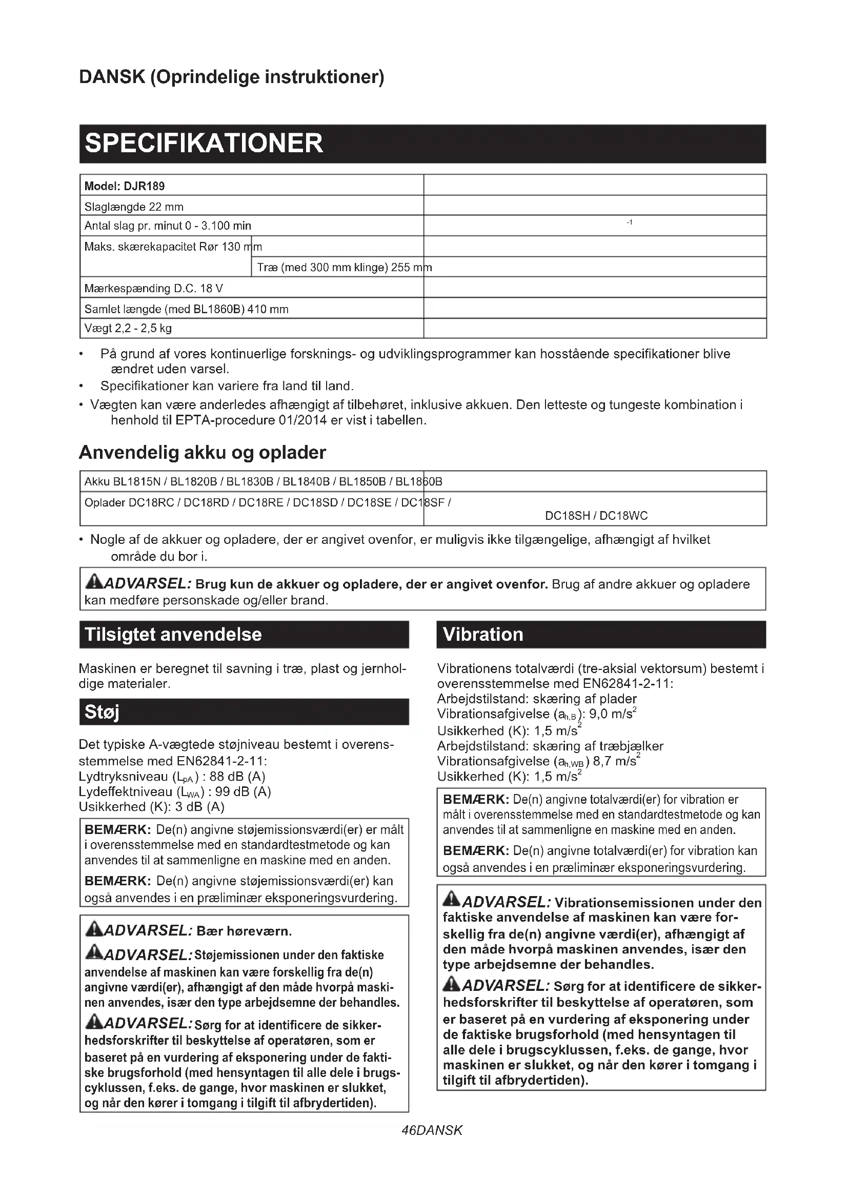 - Nogle af de akkuer og opladere, der er angivet ovenfor, er muligvis ikke tilgængelige, afhængigt af hvilket område du bor i. ADVARSEL: Brug kun de akkuer og opladere, der er angivet ovenfor. Brug af andre akkuer og opladere kan medføre personskade og/eller brand. Tilsigtet anvendelse Maskinenerberegnettilsavningitræ,plastogjernhol- dige materialer. Støj DettypiskeA-vægtedestøjniveaubestemtioverens- stemmelse med EN62841-2-11: Lydtryksniveau(L