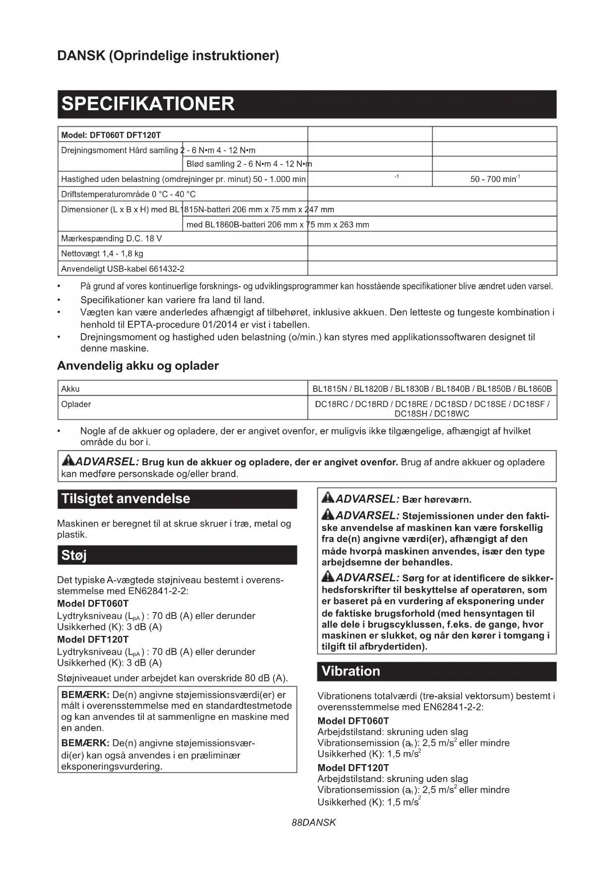 - Nogle af de akkuer og opladere, der er angivet ovenfor, er muligvis ikke tilgængelige, afhængigt af hvilket område du bor i. ADVARSEL: Brug kun de akkuer og opladere, der er angivet ovenfor. Brug af andre akkuer og opladere kan medføre personskade og/eller brand. Tilsigtet anvendelse Maskinen er beregnet til at skrue skruer i træ, metal og plastik. Støj Det typiske A-vægtede støjniveau bestemt i overens- stemmelse med EN62841-2-2: Model DFT060T Lydtryksniveau (L