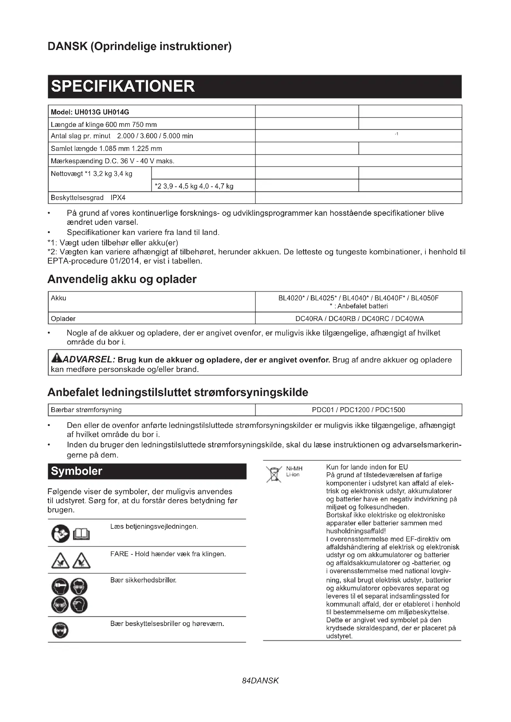 (dB(A)) Usikkerhed K (dB(A)) UH013G 83 3 93 91 2,4 UH014G 84 3 95 92 2,2 BEMÆRK:De(n)angivnestøjemissionsværdi(er)ermåltioverensstemmelsemedenstandardtestmetodeogkan anvendes til at sammenligne en maskine med en anden. BEMÆRK:De(n)angivnestøjemissionsværdi(er)kanogsåanvendesienpræliminæreksponeringsvurdering. ADVARSEL: Bær høreværn. ADVARSEL: Støjemissionen under den faktiske anvendelse af maskinen kan være forskellig fra de(n) angivne værdi(er), afhængigt af den måde hvorpå maskinen anvendes, især den type arbejdsemne der behandles. ADVARSEL: Sørg for at identicere de sikkerhedsforskrifter til beskyttelse af operatøren, som er baseret på en vurdering af eksponering under de faktiske brugsforhold (med hensyntagen til alle dele i brugscyklussen, f.eks. de gange, hvor maskinen er slukket, og når den kører i tomgang i tilgift til afbrydertiden). Vibration Vibrationenstotalværdi(tre-aksialvektorsum)bestemtioverensstemmelsemedEN62841-4-2: Model Forreste håndtag Bageste håndtag ah (m/s