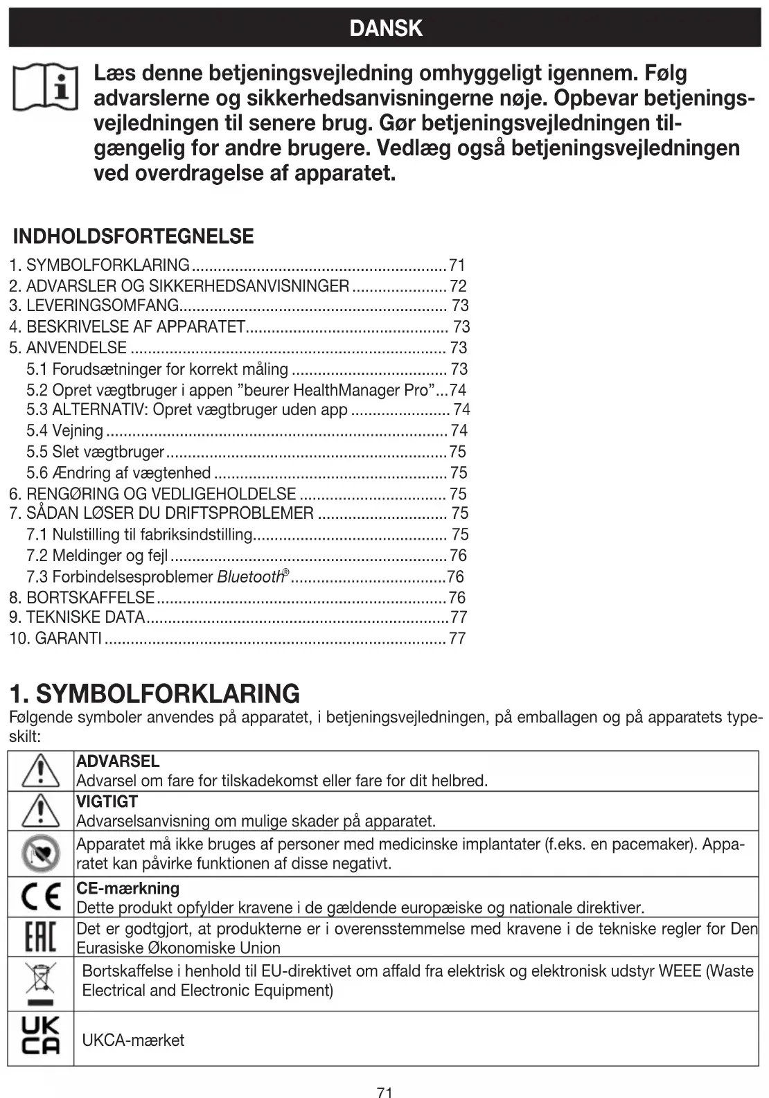 Følgende symboler anvendes på apparatet, i betjeningsvejledningen, på emballagen og på apparatets type- skilt: ADVARSEL Advarsel om fare for tilskadekomst eller fare for dit helbred. VIGTIGT Advarselsanvisning om mulige skader på apparatet. Apparatet må ikke bruges af personer med medicinske implantater (f.eks. en pacemaker). Appa- ratet kan påvirke funktionen af disse negativt. CE-mærkning Dette produkt opfylder kravene i de gældende europæiske og nationale direktiver. Det er godtgjort, at produkterne er i overensstemmelse med kravene i de tekniske regler for Den Eurasiske Økonomiske Union Bortskaelse i henhold til EU-direktivet om aald fra elektrisk og elektronisk udstyr WEEE (Waste Electrical and Electronic Equipment) UKCA-mærket72 Producent