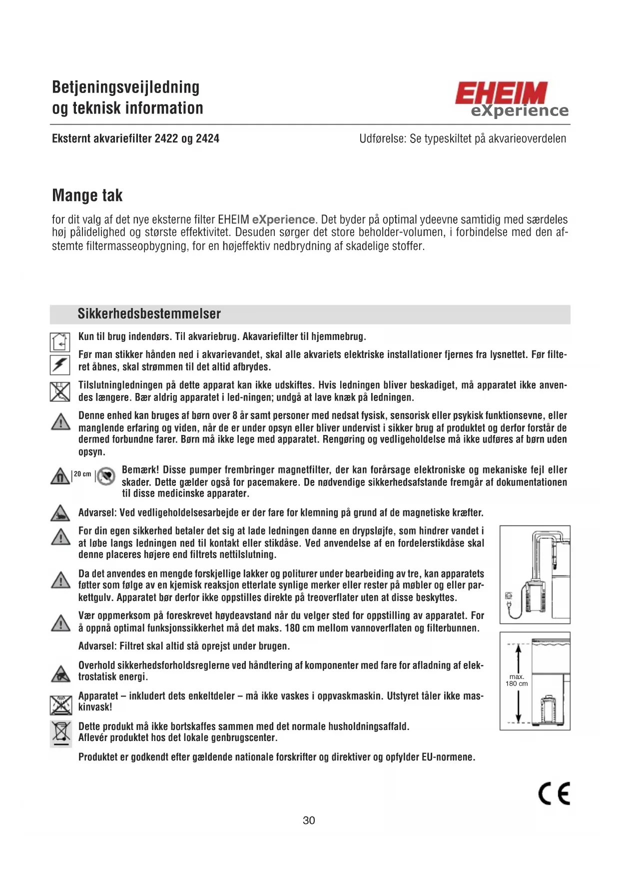 Kun til brug indendørs. Til akvariebrug. Akavariefilter til hjemmebrug. Før man stikker hånden ned i akvarievandet, skal alle akvariets elektriske installationer fjernes fra lysnettet. Før filte- ret åbnes, skal strømmen til det altid afbrydes. Tilslutningledningen på dette apparat kan ikke udskiftes. Hvis ledningen bliver beskadiget, må apparatet ikke anven- des længere. Bær aldrig apparatet i led-ningen; undgå at lave knæk på ledningen. Denne enhed kan bruges af børn over 8 år samt personer med nedsat fysisk, sensorisk eller psykisk funktionsevne, eller manglende erfaring og viden, når de er under opsyn eller bliver undervist i sikker brug af produktet og derfor forstår de dermed forbundne farer. Børn må ikke lege med apparatet. Rengøring og vedligeholdelse må ikke udføres af børn uden opsyn. Bemærk! Disse pumper frembringer magnetfilter, der kan forårsage elektroniske og mekaniske fejl eller skader. Dette gælder også for pacemakere. De nødvendige sikkerhedsafstande fremgår af dokumentationen til disse medicinske apparater. Advarsel: Ved vedligeholdelsesarbejde er der fare for klemning på grund af de magnetiske kræfter. For din egen sikkerhed betaler det sig at lade ledningen danne en drypsløjfe, som hindrer vandet i at løbe langs ledningen ned til kontakt eller stikdåse. Ved anvendelse af en fordelerstikdåse skal denne placeres højere end filtrets nettilslutning. Da det anvendes en mengde forskjellige lakker og politurer under bearbeiding av tre, kan apparatets føtter som følge av en kjemisk reaksjon etterlate synlige merker eller rester på møbler og eller par- kettgulv. Apparatet bør derfor ikke oppstilles direkte på treoverflater uten at disse beskyttes. Vær oppmerksom på foreskrevet høydeavstand når du velger sted for oppstilling av apparatet. For å oppnå optimal funksjonssikkerhet må det maks. 180 cm mellom vannoverflaten og filterbunnen. Advarsel: Filtret skal altid stå oprejst under brugen. Overhold sikkerhedsforholdsreglerne ved håndtering af komponenter med fare for afladning af elek- trostatisk energi. Apparatet – inkludert dets enkeltdeler – må ikke vaskes i oppvaskmaskin. Utstyret tåler ikke mas- kinvask! Dette produkt må ikke bortskaffes sammen med det normale husholdningsaffald. Aflevér produktet hos det lokale genbrugscenter. Produktet er godkendt efter gældende nationale forskrifter og direktiver og opfylder EU-normene. Sikkerhedsbestemmelser 20 cmmax. 180 cm Betjeningsveijledning og teknisk information Eksternt akvariefilter 2422 og 2424 Udførelse: Se typeskiltet på akvarieoverdelen Mange tak for dit valg af det nye eksterne filter EHEIM eXperience. Det byder på optimal ydeevne samtidig med særdeles høj pålidelighed og største effektivitet. Desuden sørger det store beholder-volumen, i forbindelse med den af- stemte filtermasseopbygning, for en højeffektiv nedbrydning af skadelige stoffer. eXperienceMontage (1) Alle fire låseklips på filterbeholderen vippes ud og skubbes opad. Ved hjælp af de to gribe- fordybninger kan overdelen let løftes af. (2) Filtermåtten fjernes og de enkelte filterkurve trækkes op efter hinanden ved hjælp af gribe- bøjlerne, som er forsænkede og kan trækkes ud. (3) Fyld nu filterindsatserne med EHEIM filtermasser. Fyld den nederste filterkurv med EHEIM filtermåtter. Fyld herefter den øverste filterkurv med det biologiske filtermateriale SUBSTRAT til lige under kanten. Bemærk: Fyld ikke for meget på. Røråbningen må ikke blive tilstoppet. (4) Gennemskyl filtermaterialet i filterkurvene under rindende vand, indtil de er rene. (5) Sæt filterkurven med EHEIM MECH og den blå måtte i filterbeholderen og tryk den fast nedad, til den star fast på bundbroen. Dermed opnås tætning mellem filterkurven og filterbeholderen. Den anden filterkurv isættes, idet røråbningerne placeres over hinanden og slangestykkerne danner en sikker forbindelse. Gribebøjlen forsænkes og man påser, at begge filterkurve ligger tæt over hinanden. Det andet slangestykke påsættes den øverste filterkurv. Derefter ilægges den hvide filtermåtte, således at hullet er placeret over røråbningen. Bemærk: Blødt filtervat må ikke indlægges under filterkurvenes bøjler! (6) Kontrollér, at filteroverdelens profiltætning er ren og passer nøjagtigt ned i sin not. (7) Overdelen sættes på filterbeholderen således, at filteroverdelens rørstuds passer i filterkurvens røråbning. Alle fire låseklips lukkes. (8) Bemærk: Før slangetilslutningernes adapter indsættes i filteroverdelen skal begge tætnings- ringe kontrolleres for skader og rigtig placering. For at lette monteringen indfedtes tætnings- ringene med en smule vaseline. (9) Adapteren stikkes – med låsebøjlen stående opad – ordentligt ind i den dertil beregnede åbning på filteroverdelen, og mens man samtidig trykker på adapteren, lukkes adapter- låsebøjlen, til den går i indgreb.