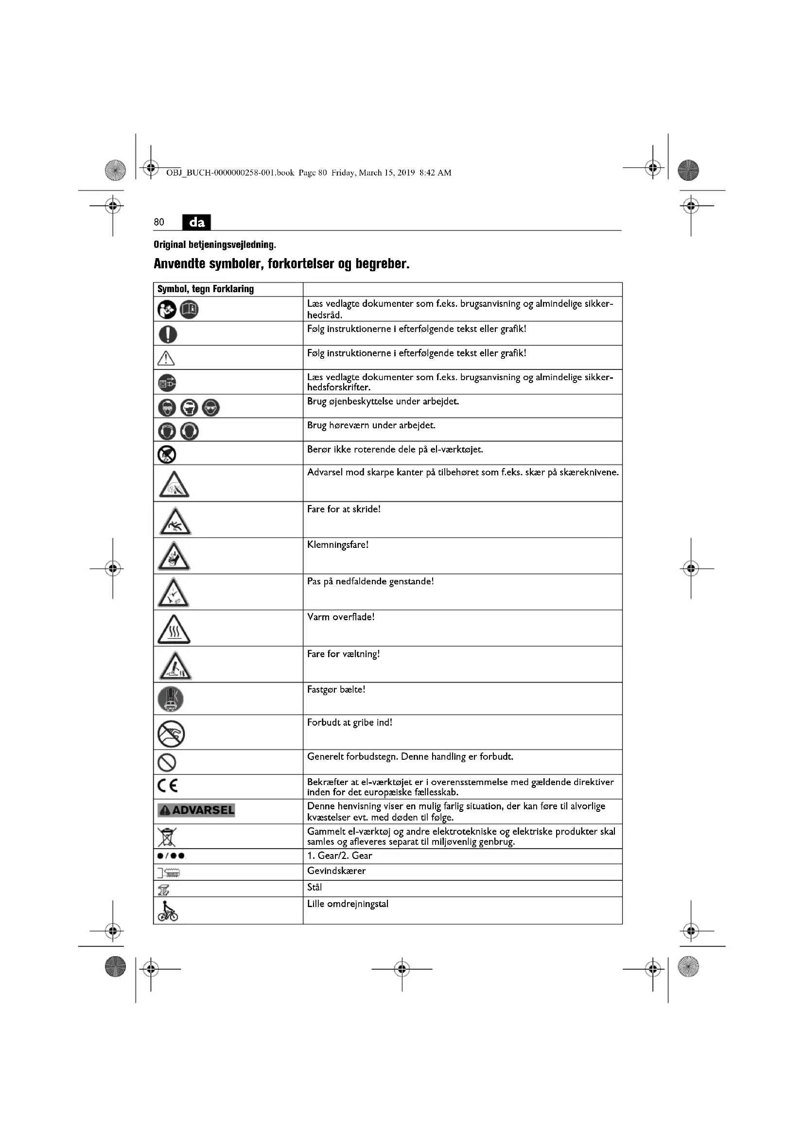 Original betjeningsvejledning. Anvendte symboler, forkortelser og begreber. Symbol, tegn Forklaring Læs vedlagte dokumenter som f.eks. brugsanvisning og almindelige sikker- hedsråd. Følg instruktionerne i efterfølgende tekst eller grafik! Følg instruktionerne i efterfølgende tekst eller grafik! Læs vedlagte dokumenter som f.eks. brugsanvisning og almindelige sikker- hedsforskrifter. Brug øjenbeskyttelse under arbejdet. Brug høreværn under arbejdet. Berør ikke roterende dele på el-værktøjet. Advarsel mod skarpe kanter på tilbehøret som f.eks. skær på skæreknivene. Fare for at skride! Klemningsfare! Pas på nedfaldende genstande! Varm overflade! Fare for væltning! Fastgør bælte! Forbudt at gribe ind! Generelt forbudstegn. Denne handling er forbudt. Bekræfter at el-værktøjet er i overensstemmelse med gældende direktiver inden for det europæiske fællesskab. Denne henvisning viser en mulig farlig situation, der kan føre til alvorlige kvæstelser evt. med døden til følge. Gammelt el-værktøj og andre elektrotekniske og elektriske produkter skal samles og afleveres separat til miljøvenlig genbrug.