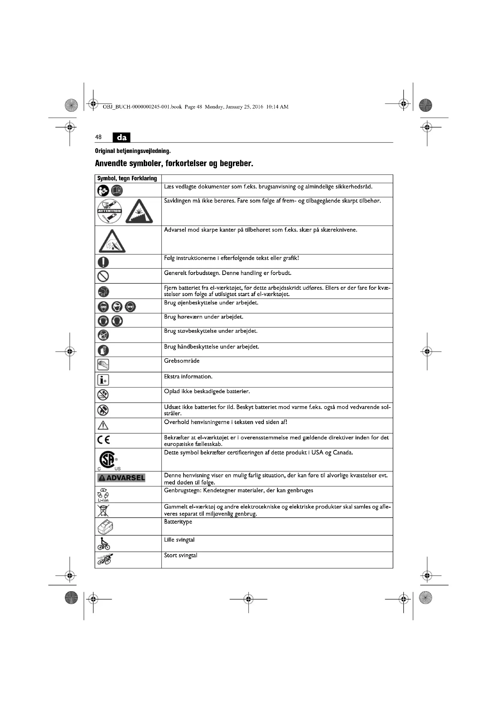 Original betjeningsvejledning. Anvendte symboler, forkortelser og begreber. Symbol, tegn Forklaring Læs vedlagte dokumenter som f.eks. brugsanvisning og almindelige sikkerhedsråd. Savklingen må ikke berøres. Fare som følge af frem- og tilbagegående skarpt tilbehør. Advarsel mod skarpe kanter på tilbehøret som f.eks. skær på skæreknivene. Følg instruktionerne i efterfølgende tekst eller grafik! Generelt forbudstegn. Denne handling er forbudt. Fjern batteriet fra el-værktøjet, før dette arbejdsskridt udføres. Ellers er der fare for kvæ- stelser som følge af utilsigtet start af el-værktøjet. Brug øjenbeskyttelse under arbejdet. Brug høreværn under arbejdet. Brug støvbeskyttelse under arbejdet. Brug håndbeskyttelse under arbejdet. Grebsområde Ekstra information. Oplad ikke beskadigede batterier. Udsæt ikke batteriet for ild. Beskyt batteriet mod varme f.eks. også mod vedvarende sol- stråler. Overhold henvisningerne i teksten ved siden af! Bekræfter at el-værktøjet er i overensstemmelse med gældende direktiver inden for det europæiske fællesskab. Dette symbol bekræfter certificeringen af dette produkt i USA og Canada. Denne henvisning viser en mulig farlig situation, der kan føre til alvorlige kvæstelser evt. med døden til følge. Genbrugstegn: Kendetegner materialer, der kan genbruges Gammelt el-værktøj og andre elektrotekniske og elektriske produkter skal samles og afle- veres separat til miljøvenlig genbrug. Batteritype Lille svingtal Stort svingtal OBJ_BUCH-0000000245-001.book Page 48 Monday, January 25, 2016 10:14 AM49