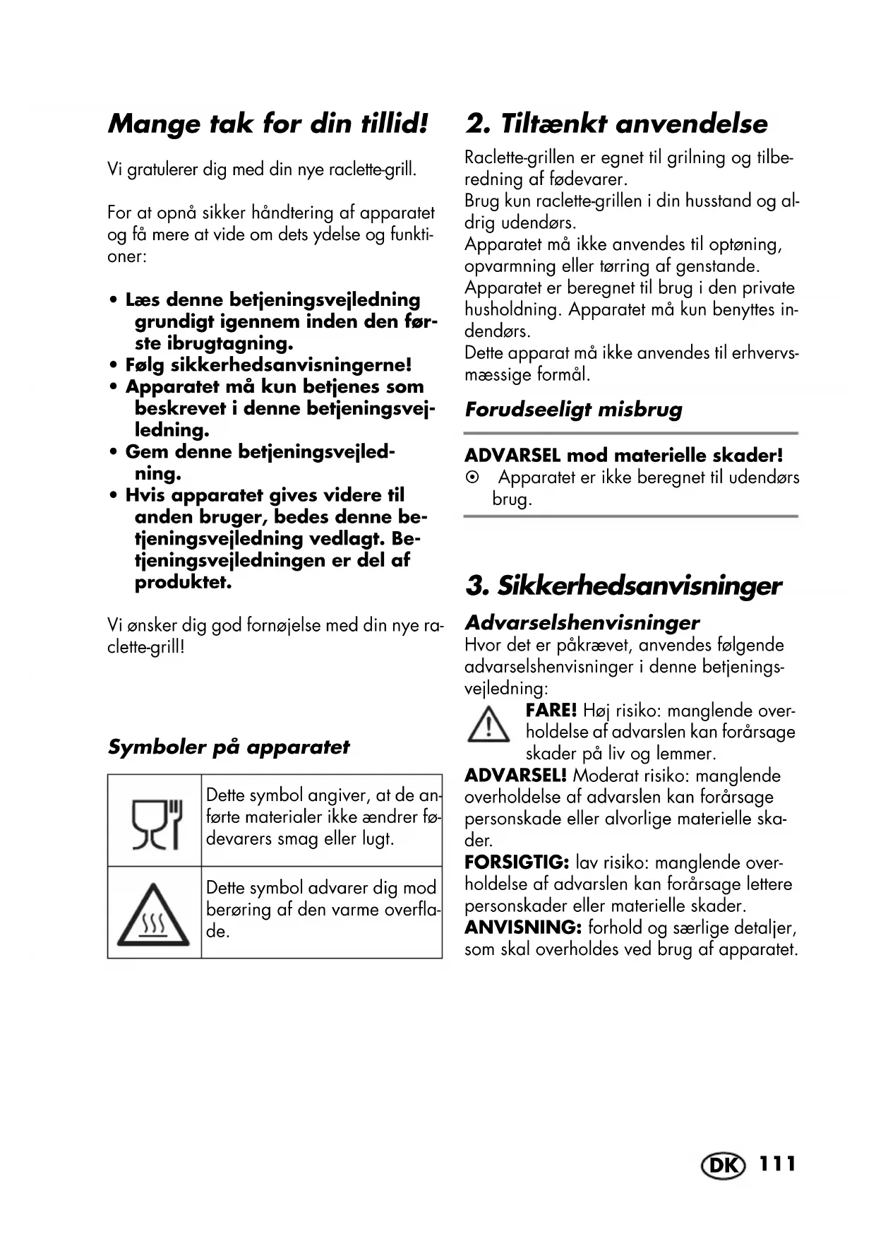Raclette-grillen er egnet til grilning og tilbe- redning af fødevarer. Brug kun raclette-grillen i din husstand og al- drig udendørs. Apparatet må ikke anvendes til optøning, opvarmning eller tørring af genstande. Apparatet er beregnet til brug i den private husholdning. Apparatet må kun benyttes in- dendørs. Dette apparat må ikke anvendes til erhvervs- mæssige formål. Forudseeligt misbrug ADVARSEL mod materielle skader! ~ Apparatet er ikke beregnet til udendørs brug.