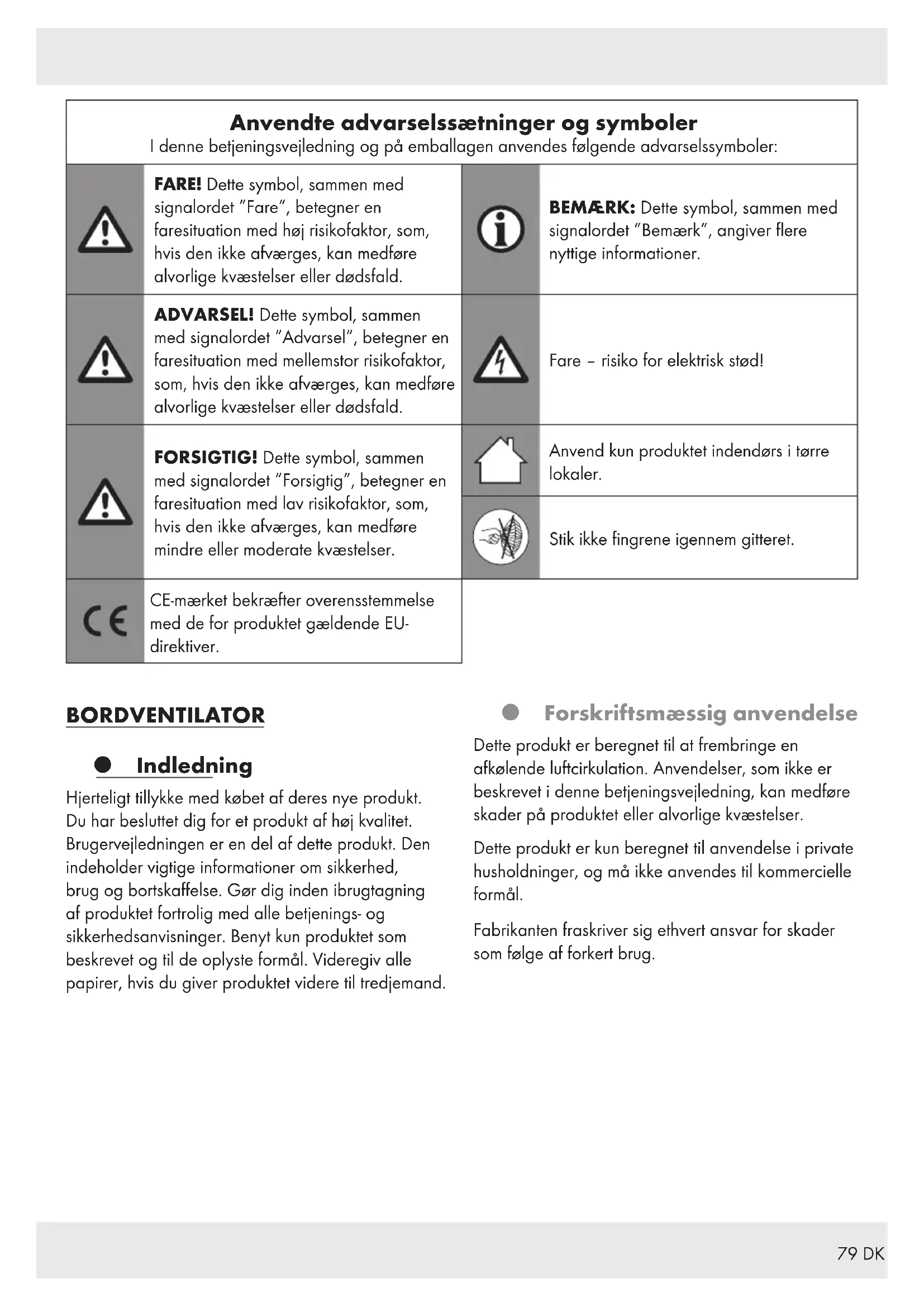 DOKUMENTER MEDFØLGE! Hvis der opstår skader som følge af, at betjeningsvejledningen ikke følges, bortfalder erstatningsansvaret! Leverandøren påtager sig intet ansvar for følgeskader! Leverandøren påtager sig intet ansvar for ting- eller personskader, der opstår som følge af forkert anvendelse, eller hvis sikkerhedsanvisningerne ikke følges! Børn og personer med handicap mFARE! Risiko for kvælning! Børn må ikke efterlades med emballagen uden opsyn. Emballagen udgør en kvælningsrisiko. Børn undervurderer ofte de dermed forbundne farer. Hold emballagen uden for børns rækkevidde. Dette produkt kan anvendes af børn fra 8år og opefter, samt af personer med reducerede, fysiske, sensoriske eller mentale færdigheder eller mangel på erfaring og kundskaber, hvis de er under opsyn, eller hvis de er instrueret i sikker brug af produktet og indforstået med de risici, der er forbundet hermed. Rengøring og brugervedligeholdelse må kun udføres af børn, hvis de er under opsyn. Børn må ikke lege med produktet.82 DK Elektrisk sikkerhed mADVARSEL! Fare for kvæstelser! Sluk for produktet, og afbryd det fra lysnettet, før produktet rengøres, og når produktet ikke anvendes. mADVARSEL! Risiko for elektriske stød! Kontrollér, at netspændingen på typeskiltet stemmer overens med spændingen på forsyningsnettet. mADVARSEL! Risiko for elektriske stød! Hvis produktets tilslutningsledning bliver beskadiget, skal den udskiftes af producentens kundeservice eller en tilsvarende autoriseret reparatør, for at undgå sikkerhedsrisici. Betjening Anvend kun produktet indendørs i tørre lokaler. Beskyt produktet, tilslutningsledningen og netstikket mod støv, direkte sol, vanddråber og -stænk. mFORSIGTIG! Fare for kvæstelser! Afbryd altid produktet fra netspændingen, før sikkerhedsgitteret fjernes. mFORSIGTIG! Fare for kvæstelser! Anvend aldrig produktet uden eller med et beskadiget sikkerhedsgitter. mFORSIGTIG! Fare for kvæstelser! Under brug skal du holde hænder, hår, beklædning og andre genstande væk fra sikkerhedsgitteret for at undgå kvæstelser og skader på produktet.83 DK Før produktet tages i brug Udpakning Fjern emballagen. Kontroller om produktet er beskadiget. Montering Nødvendigt tilbehør: Krydskærvskruetrækker Antal personer der er nødvendige til monteringen: 1voksen Fig. Trin
