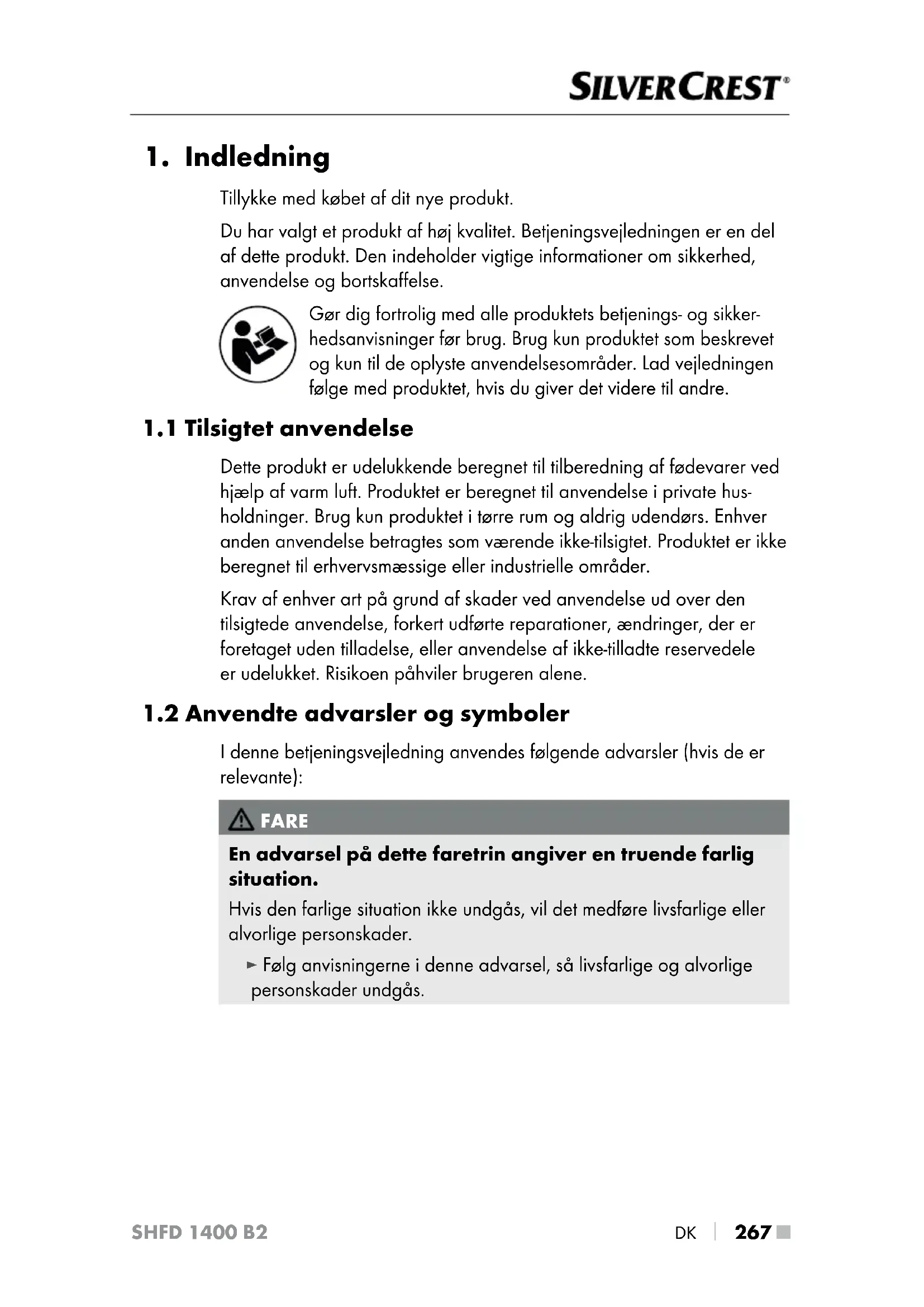 DK SHFD 1400 B2 ADVARSEL! FARE FOR PERSONSKADER! ► Tilslut produktet til en let tilgængelig stikkontakt. Sørg for, at det er nemt at komme til stikket i farlige situationer. ► Dette produkt kan bruges af børn over 8 år samt af personer med reducerede fysiske, sensoriske eller mentale evner eller manglende erfaring og/eller viden, hvis de er under opsyn eller er blevet instrueret i sikker brug af produktet og har forstået de farer, som kan være forbundet med det. ► Rengøring og vedligeholdelse må ikke udføres af børn, medmindre de er ældre end 8 år og under opsyn. ► Børn under 8 år skal holdes på afstand af produktet og tilslutningsledningen. ► Børn må ikke lege med produktet. ► Under tilberedningen frigøres der varm damp. Hold sikker afstand til dampen. ► Produktets dele bliver meget varme under brug. For at undgå forbrændinger må du ikke røre ved disse dele. Rør ikke ved produktets inderside, når det er i brug. Tag kun fat i håndtaget og betjeningselementerne. ► Flyt ikke produktet, mens det bruges, da der ellers er fare for forbrændinger! ► Lad produktet køle af, før du rengør det eller udskifter tilbe- høret. ADVARSEL! BRANDFARE! ► Produktet anvender kun varmluft. Fyld aldrig olie eller andre væsker direkte i gryden. Ellers er der brandfare! ► Brug aldrig en ekstern timer eller et separat fjernbetjenings- system til betjening af produktet. ► Brug ikke produktet i nærheden af varme overflader eller brændbare materialer.DK