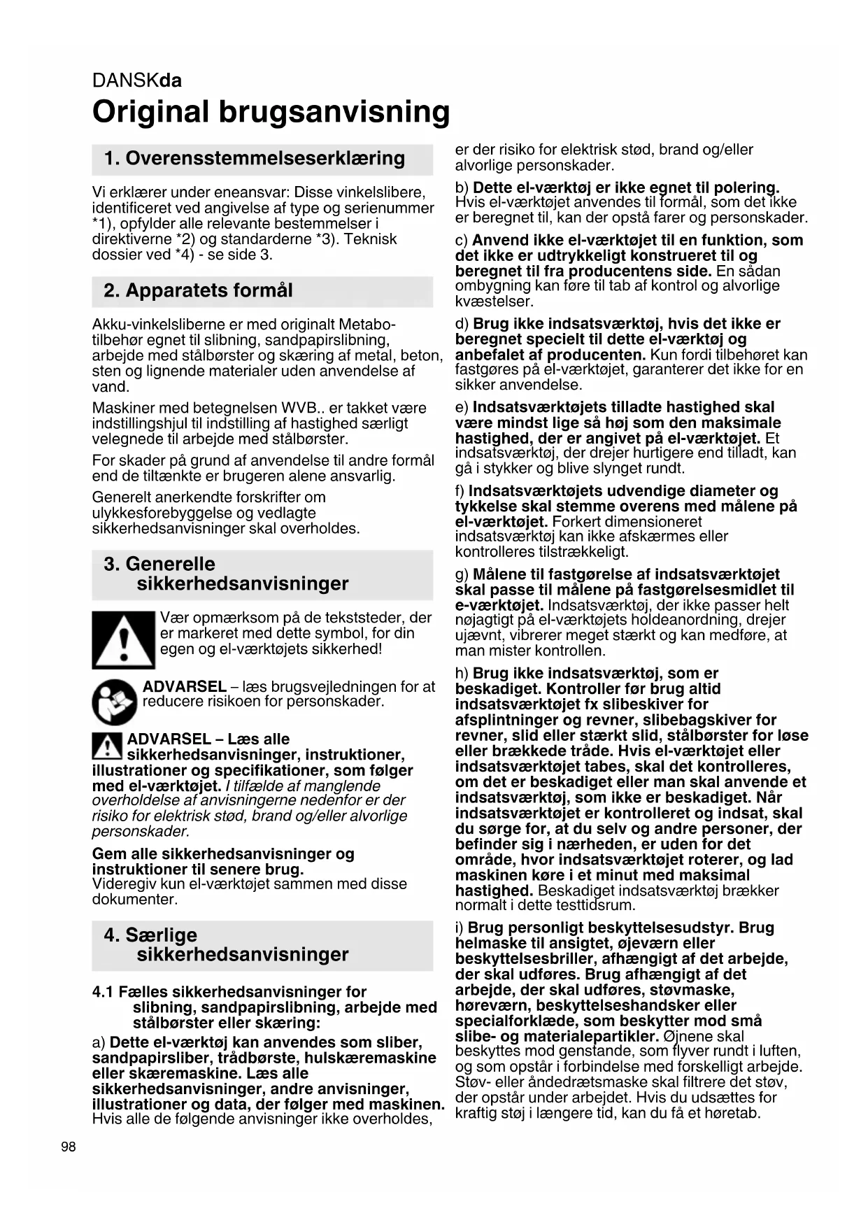 Original brugsanvisning Vi erklærer under eneansvar: Disse vinkelslibere, identificeret ved angivelse af type og serienummer *1), opfylder alle relevante bestemmelser i direktiverne *2) og standarderne *3). Teknisk dossier ved *4) - se side 3. Akku-vinkelsliberne er med originalt Metabo- tilbehør egnet til slibning, sandpapirslibning, arbejde med stålbørster og skæring af metal, beton, sten og lignende materialer uden anvendelse af vand. Maskiner med betegnelsen WVB.. er takket være indstillingshjul til indstilling af hastighed særligt velegnede til arbejde med stålbørster. For skader på grund af anvendelse til andre formål end de tiltænkte er brugeren alene ansvarlig. Generelt anerkendte forskrifter om ulykkesforebyggelse og vedlagte sikkerhedsanvisninger skal overholdes. Vær opmærksom på de tekststeder, der er markeret med dette symbol, for din egen og el-værktøjets sikkerhed! ADVARSEL – læs brugsvejledningen for at reducere risikoen for personskader. ADVARSEL – Læs alle sikkerhedsanvisninger, instruktioner, illustrationer og specifikationer, som følger med el-værktøjet. I tilfælde af manglende overholdelse af anvisningerne nedenfor er der risiko for elektrisk stød, brand og/eller alvorlige personskader. Gem alle sikkerhedsanvisninger og instruktioner til senere brug. Videregiv kun el-værktøjet sammen med disse dokumenter.