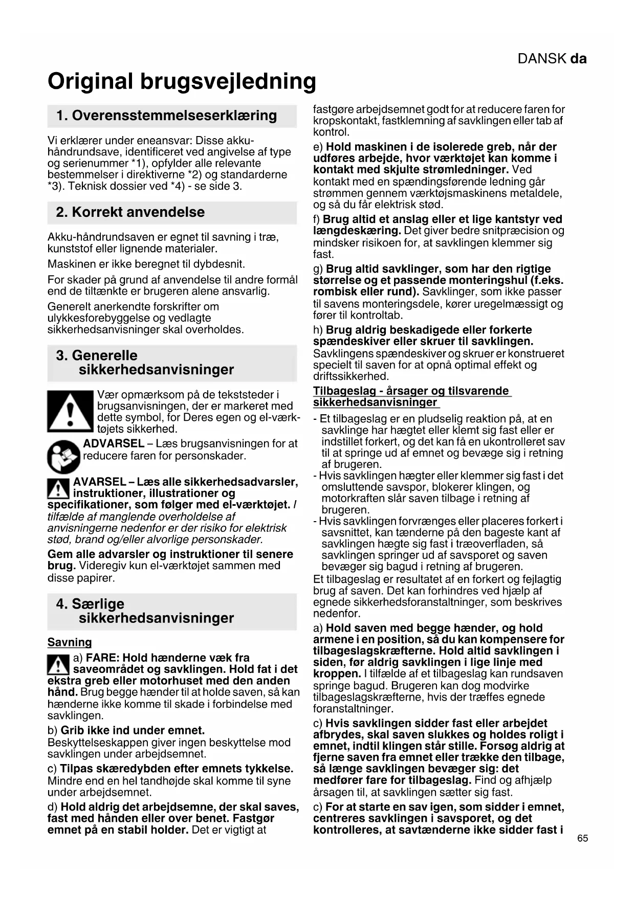 Original brugsvejledning Vi erklærer under eneansvar: Disse akku- håndrundsave, identificeret ved angivelse af type og serienummer *1), opfylder alle relevante bestemmelser i direktiverne *2) og standarderne *3). Teknisk dossier ved *4) - se side 3. Akku-håndrundsaven er egnet til savning i træ, kunststof eller lignende materialer. Maskinen er ikke beregnet til dybdesnit. For skader på grund af anvendelse til andre formål end de tiltænkte er brugeren alene ansvarlig. Generelt anerkendte forskrifter om ulykkesforebyggelse og vedlagte sikkerhedsanvisninger skal overholdes. Vær opmærksom på de tekststeder i brugsanvisningen, der er markeret med dette symbol, for Deres egen og el-værk- tøjets sikkerhed. ADVARSEL – Læs brugsanvisningen for at reducere faren for personskader. AVARSEL – Læs alle sikkerhedsadvarsler, instruktioner, illustrationer og specifikationer, som følger med el-værktøjet. I tilfælde af manglende overholdelse af anvisningerne nedenfor er der risiko for elektrisk stød, brand og/eller alvorlige personskader. Gem alle advarsler og instruktioner til senere brug. Videregiv kun el-værktøjet sammen med disse papirer. Savning a) FARE: Hold hænderne væk fra saveområdet og savklingen. Hold fat i det ekstra greb eller motorhuset med den anden hånd. Brug begge hænder til at holde saven, så kan hænderne ikke komme til skade i forbindelse med savklingen. b) Grib ikke ind under emnet. Beskyttelseskappen giver ingen beskyttelse mod savklingen under arbejdsemnet. c) Tilpas skæredybden efter emnets tykkelse. Mindre end en hel tandhøjde skal komme til syne under arbejdsemnet. d) Hold aldrig det arbejdsemne, der skal saves, fast med hånden eller over benet. Fastgør emnet på en stabil holder. Det er vigtigt at fastgøre arbejdsemnet godt for at reducere faren for kropskontakt, fastklemning af savklingen eller tab af kontrol. e) Hold maskinen i de isolerede greb, når der udføres arbejde, hvor værktøjet kan komme i kontakt med skjulte strømledninger. Ved kontakt med en spændingsførende ledning går strømmen gennem værktøjsmaskinens metaldele, og så du får elektrisk stød. f) Brug altid et anslag eller et lige kantstyr ved længdeskæring. Det giver bedre snitpræcision og mindsker risikoen for, at savklingen klemmer sig fast. g) Brug altid savklinger, som har den rigtige størrelse og et passende monteringshul (f.eks. rombisk eller rund). Savklinger, som ikke passer til savens monteringsdele, kører uregelmæssigt og fører til kontroltab. h) Brug aldrig beskadigede eller forkerte spændeskiver eller skruer til savklingen. Savklingens spændeskiver og skruer er konstrueret specielt til saven for at opnå optimal effekt og driftssikkerhed. Tilbageslag - årsager og tilsvarende sikkerhedsanvisninger - Et tilbageslag er en pludselig reaktion på, at en savklinge har hægtet eller klemt sig fast eller er indstillet forkert, og det kan få en ukontrolleret sav til at springe ud af emnet og bevæge sig i retning af brugeren. - Hvis savklingen hægter eller klemmer sig fast i det omsluttende savspor, blokerer klingen, og motorkraften slår saven tilbage i retning af brugeren. - Hvis savklingen forvrænges eller placeres forkert i savsnittet, kan tænderne på den bageste kant af savklingen hægte sig fast i træoverfladen, så savklingen springer ud af savsporet og saven bevæger sig bagud i retning af brugeren. Et tilbageslag er resultatet af en forkert og fejlagtig brug af saven. Det kan forhindres ved hjælp af egnede sikkerhedsforanstaltninger, som beskrives nedenfor. a) Hold saven med begge hænder, og hold armene i en position, så du kan kompensere for tilbageslagskræfterne. Hold altid savklingen i siden, før aldrig savklingen i lige linje med kroppen. I tilfælde af et tilbageslag kan rundsaven springe bagud. Brugeren kan dog modvirke tilbageslagskræfterne, hvis der træffes egnede foranstaltninger. c) Hvis savklingen sidder fast eller arbejdet afbrydes, skal saven slukkes og holdes roligt i emnet, indtil klingen står stille. Forsøg aldrig at fjerne saven fra emnet eller trække den tilbage, så længe savklingen bevæger sig: det medfører fare for tilbageslag. Find og afhjælp årsagen til, at savklingen sætter sig fast. c) For at starte en sav igen, som sidder i emnet, centreres savklingen i savsporet, og det kontrolleres, at savtænderne ikke sidder fast i
