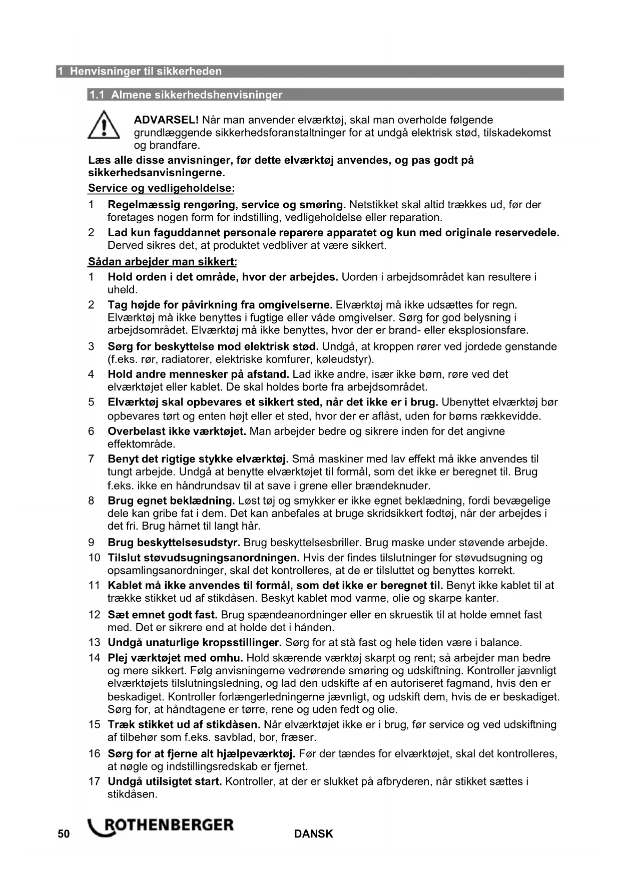ADVARSEL! Når man anvender elværktøj, skal man overholde følgende grundlæggende sikkerhedsforanstaltninger for at undgå elektrisk stød, tilskadekomst og brandfare. Læs alle disse anvisninger, før dette elværktøj anvendes, og pas godt på sikkerhedsanvisningerne. Service og vedligeholdelse: 1 Regelmæssig rengøring, service og smøring. Netstikket skal altid trækkes ud, før der foretages nogen form for indstilling, vedligeholdelse eller reparation. 2 Lad kun faguddannet personale reparere apparatet og kun med originale reservedele. Derved sikres det, at produktet vedbliver at være sikkert. Sådan arbejder man sikkert: 1 Hold orden i det område, hvor der arbejdes. Uorden i arbejdsområdet kan resultere i uheld. 2 Tag højde for påvirkning fra omgivelserne. Elværktøj må ikke udsættes for regn. Elværktøj må ikke benyttes i fugtige eller våde omgivelser. Sørg for god belysning i arbejdsområdet. Elværktøj må ikke benyttes, hvor der er brand- eller eksplosionsfare. 3 Sørg for beskyttelse mod elektrisk stød. Undgå, at kroppen rører ved jordede genstande (f.eks. rør, radiatorer, elektriske komfurer, køleudstyr). 4 Hold andre mennesker på afstand. Lad ikke andre, især ikke børn, røre ved det elværktøjet eller kablet. De skal holdes borte fra arbejdsområdet. 5 Elværktøj skal opbevares et sikkert sted, når det ikke er i brug. Ubenyttet elværktøj bør opbevares tørt og enten højt eller et sted, hvor der er aflåst, uden for børns rækkevidde. 6 Overbelast ikke værktøjet. Man arbejder bedre og sikrere inden for det angivne effektområde. 7 Benyt det rigtige stykke elværktøj. Små maskiner med lav effekt må ikke anvendes til tungt arbejde. Undgå at benytte elværktøjet til formål, som det ikke er beregnet til. Brug f.eks. ikke en håndrundsav til at save i grene eller brændeknuder. 8 Brug egnet beklædning. Løst tøj og smykker er ikke egnet beklædning, fordi bevægelige dele kan gribe fat i dem. Det kan anbefales at bruge skridsikkert fodtøj, når der arbejdes i det fri. Brug hårnet til langt hår. 9 Brug beskyttelsesudstyr. Brug beskyttelsesbriller. Brug maske under støvende arbejde. 10 Tilslut støvudsugningsanordningen. Hvis der findes tilslutninger for støvudsugning og opsamlingsanordninger, skal det kontrolleres, at de er tilsluttet og benyttes korrekt. 11 Kablet må ikke anvendes til formål, som det ikke er beregnet til. Benyt ikke kablet til at trække stikket ud af stikdåsen. Beskyt kablet mod varme, olie og skarpe kanter. 12 Sæt emnet godt fast. Brug spændeanordninger eller en skruestik til at holde emnet fast med. Det er sikrere end at holde det i hånden. 13 Undgå unaturlige kropsstillinger. Sørg for at stå fast og hele tiden være i balance. 14 Plej værktøjet med omhu. Hold skærende værktøj skarpt og rent; så arbejder man bedre og mere sikkert. Følg anvisningerne vedrørende smøring og udskiftning. Kontroller jævnligt elværktøjets tilslutningsledning, og lad den udskifte af en autoriseret fagmand, hvis den er beskadiget. Kontroller forlængerledningerne jævnligt, og udskift dem, hvis de er beskadiget. Sørg for, at håndtagene er tørre, rene og uden fedt og olie. 15 Træk stikket ud af stikdåsen. Når elværktøjet ikke er i brug, før service og ved udskiftning af tilbehør som f.eks. savblad, bor, fræser. 16 Sørg for at fjerne alt hjælpeværktøj. Før der tændes for elværktøjet, skal det kontrolleres, at nøgle og indstillingsredskab er fjernet. 17 Undgå utilsigtet start. Kontroller, at der er slukket på afbryderen, når stikket sættes i stikdåsen.DANSK 51 18 Benyt forlængerkabler til udendørs brug. Anvend kun forlængerkabler, der er mærket som godkendt til udendørs brug, når der arbejdes i det fri. 19 Vær koncentreret. Koncentrer Dem om den opgave, der udføres. Grib arbejdet fornuftigt an. Benyt ikke elværktøjet, når De er ukoncentreret. 20 Kontroller elværktøjet for eventuelle skader. Før man går i gang med at arbejde med elværktøjet skal det undersøges omhyggeligt, om beskyttelsesanordninger eller dele, der let beskadiges, fungerer perfekt. Kontroller, om de bevægelige dele fungerer perfekt og ikke sætter sig fast, og om der er beskadigede dele. Samtlige dele skal være korrekt monteret og opfylde alle betingelser for, at elværktøjet kan fungere perfekt. Beskadigede beskyttelsesanordninger og dele skal repareres på et godkendt værksted eller udskiftes, medmindre andet er angivet i brugsanvisningen. Beskadigede kontakter skal repareres på et kundeværksted. Benyt aldrig elværktøj, som ikke kan tændes og slukkes på sin egen kontakt. 21 Bemærk. Brug af andre indsatser og andet tilbehør kan indebære risiko for tilskadekomst. 22 Elværktøj skal repareres af en fagmand. Dette elværktøj opfylder de relevante sikkerhedsbestemmelser. Reparationer må kun udføres af en fagmand, som anvender originale reservedele; ellers kan brugeren komme til skade.