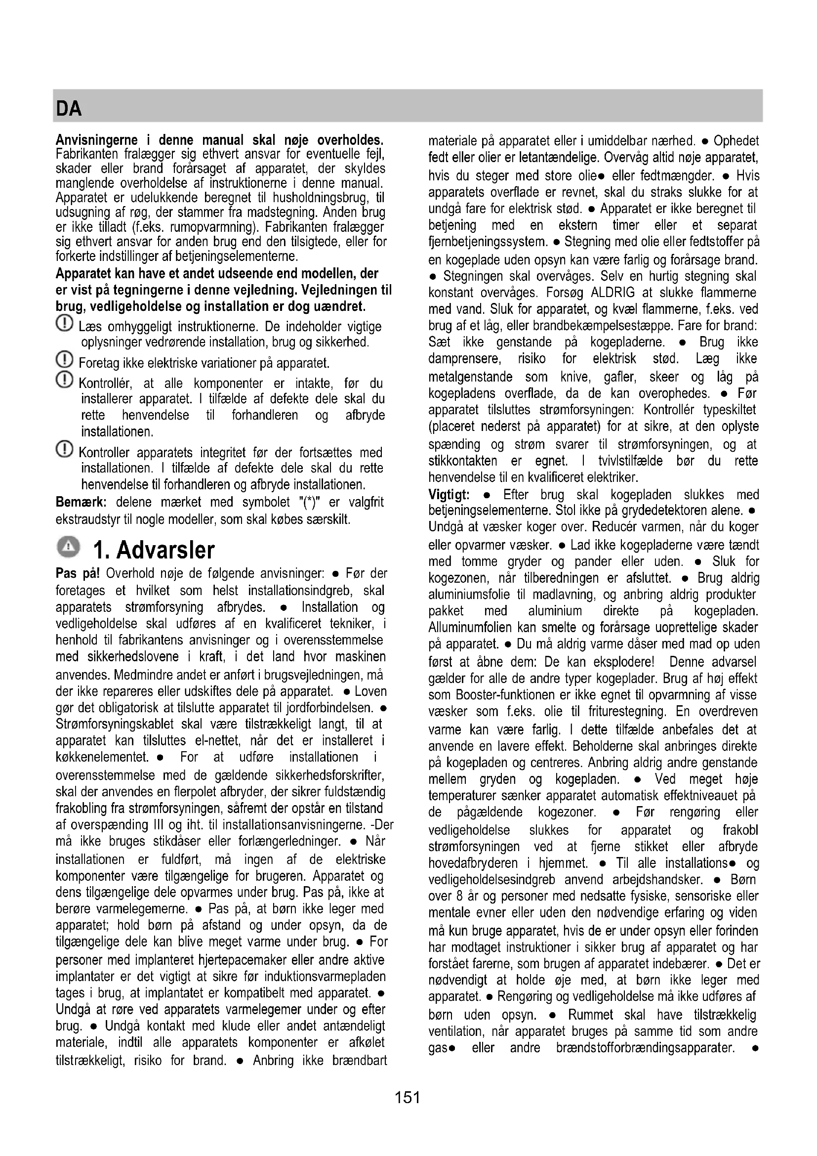 Pas på! Overhold nøje de følgende anvisninger: ● Før der foretages et hvilket som helst installationsindgreb, skal apparatets strømforsyning afbrydes. ● Installation og vedligeholdelse skal udføres af en kvalificeret tekniker, i henhold til fabrikantens anvisninger og i overensstemmelse med sikkerhedslovene i kraft, i det land hvor maskinen anvendes. Medmindre andet er anført i brugsvejledningen, må der ikke repareres eller udskiftes dele på apparatet. ● Loven gør det obligatorisk at tilslutte apparatet til jordforbindelsen. ● Strømforsyningskablet skal være tilstrækkeligt langt, til at apparatet kan tilsluttes el-nettet, når det er installeret i køkkenelementet. ● For at udføre installationen i overensstemmelse med de gældende sikkerhedsforskrifter, skal der anvendes en flerpolet afbryder, der sikrer fuldstændig frakobling fra strømforsyningen, såfremt der opstår en tilstand af overspænding III og iht. til installationsanvisningerne. -Der må ikke bruges stikdåser eller forlængerledninger. ● Når installationen er fuldført, må ingen af de elektriske komponenter være tilgængelige for brugeren. Apparatet og dens tilgængelige dele opvarmes under brug. Pas på, ikke at berøre varmelegemerne. ● Pas på, at børn ikke leger med apparatet; hold børn på afstand og under opsyn, da de tilgængelige dele kan blive meget varme under brug. ● For personer med implanteret hjertepacemaker eller andre aktive implantater er det vigtigt at sikre før induktionsvarmepladen tages i brug, at implantatet er kompatibelt med apparatet. ● Undgå at røre ved apparatets varmelegemer under og efter brug. ● Undgå kontakt med klude eller andet antændeligt materiale, indtil alle apparatets komponenter er afkølet tilstrækkeligt, risiko for brand. ● Anbring ikke brændbart materiale på apparatet eller i umiddelbar nærhed. ● Ophedet fedt eller olier er letantændelige. Overvåg altid nøje apparatet, hvis du steger med store olie● eller fedtmængder. ● Hvis apparatets overflade er revnet, skal du straks slukke for at undgå fare for elektrisk stød. ● Apparatet er ikke beregnet til betjening med en ekstern timer eller et separat fjernbetjeningssystem. ● Stegning med olie eller fedtstoffer på en kogeplade uden opsyn kan være farlig og forårsage brand. ● Stegningen skal overvåges. Selv en hurtig stegning skal konstant overvåges. Forsøg ALDRIG at slukke flammerne med vand. Sluk for apparatet, og kvæl flammerne, f.eks. ved brug af et låg, eller brandbekæmpelsestæppe. Fare for brand: Sæt ikke genstande på kogepladerne. ● Brug ikke damprensere, risiko for elektrisk stød. Læg ikke metalgenstande som knive, gafler, skeer og låg på kogepladens overflade, da de kan overophedes. ● Før apparatet tilsluttes strømforsyningen: Kontrollér typeskiltet (placeret nederst på apparatet) for at sikre, at den oplyste spænding og strøm svarer til strømforsyningen, og at stikkontakten er egnet. I tvivlstilfælde bør du rette henvendelse til en kvalificeret elektriker. Vigtigt: ● Efter brug skal kogepladen slukkes med betjeningselementerne. Stol ikke på grydedetektoren alene. ● Undgå at væsker koger over. Reducér varmen, når du koger eller opvarmer væsker. ● Lad ikke kogepladerne være tændt med tomme gryder og pander eller uden. ● Sluk for kogezonen, når tilberedningen er afsluttet. ● Brug aldrig aluminiumsfolie til madlavning, og anbring aldrig produkter pakket med aluminium direkte på kogepladen. Alluminumfolien kan smelte og forårsage uoprettelige skader på apparatet. ● Du må aldrig varme dåser med mad op uden først at åbne dem: De kan eksplodere! Denne advarsel gælder for alle de andre typer kogeplader. Brug af høj effekt som Booster-funktionen er ikke egnet til opvarmning af visse væsker som f.eks. olie til friturestegning. En overdreven varme kan være farlig. I dette tilfælde anbefales det at anvende en lavere effekt. Beholderne skal anbringes direkte på kogepladen og centreres. Anbring aldrig andre genstande mellem gryden og kogepladen. ● Ved meget høje temperaturer sænker apparatet automatisk effektniveauet på de pågældende kogezoner. ● Før rengøring eller vedligeholdelse slukkes for apparatet og frakobl strømforsyningen ved at fjerne stikket eller afbryde hovedafbryderen i hjemmet. ● Til alle installations● og vedligeholdelsesindgreb anvend arbejdshandsker. ● Børn over 8 år og personer med nedsatte fysiske, sensoriske eller mentale evner eller uden den nødvendige erfaring og viden må kun bruge apparatet, hvis de er under opsyn eller forinden har modtaget instruktioner i sikker brug af apparatet og har forstået farerne, som brugen af apparatet indebærer. ● Det er nødvendigt at holde øje med, at børn ikke leger med apparatet. ● Rengøring og vedligeholdelse må ikke udføres af børn uden opsyn. ● Rummet skal have tilstrækkelig ventilation, når apparatet bruges på samme tid som andre gas● eller andre brændstofforbrændingsapparater. ●152 Apparatet skal rengøres hyppigt både indvendigt og udvendigt (MINDST ÉN GANG OM MÅNEDEN), under alle omstændigheder skal det overholdes, hvad der udtrykkeligt er angivet i vedligeholdelsesinstruktionerne. ● Manglende overholdelse af reglerne for rengøring af apparatet og udskiftning og rengøring af filtre medfører brandfare. ● Madlavning med flambé er strengt forbudt. ● Brug af åben ild er skadeligt for filtrene og kan forårsage brand og skal derfor altid undgås. ● Friturestegning må kun udføres under opsyn for at undgå, at den overophedede olie bryder i brand. ● Advarsel!: Når kogepladen er i brug, kan apparatets tilgængelige dele blive meget varme. ● Advarsel! Tilslut ikke apparatet til strømforsyningen, før installationen er gennemført. ● Overhold nøje lokale bestemmelser med hensyn til de tekniske og sikkerhedsmæssige forholdsregler, der skal træffes ved udledning af røgen. ● Den udsugede l