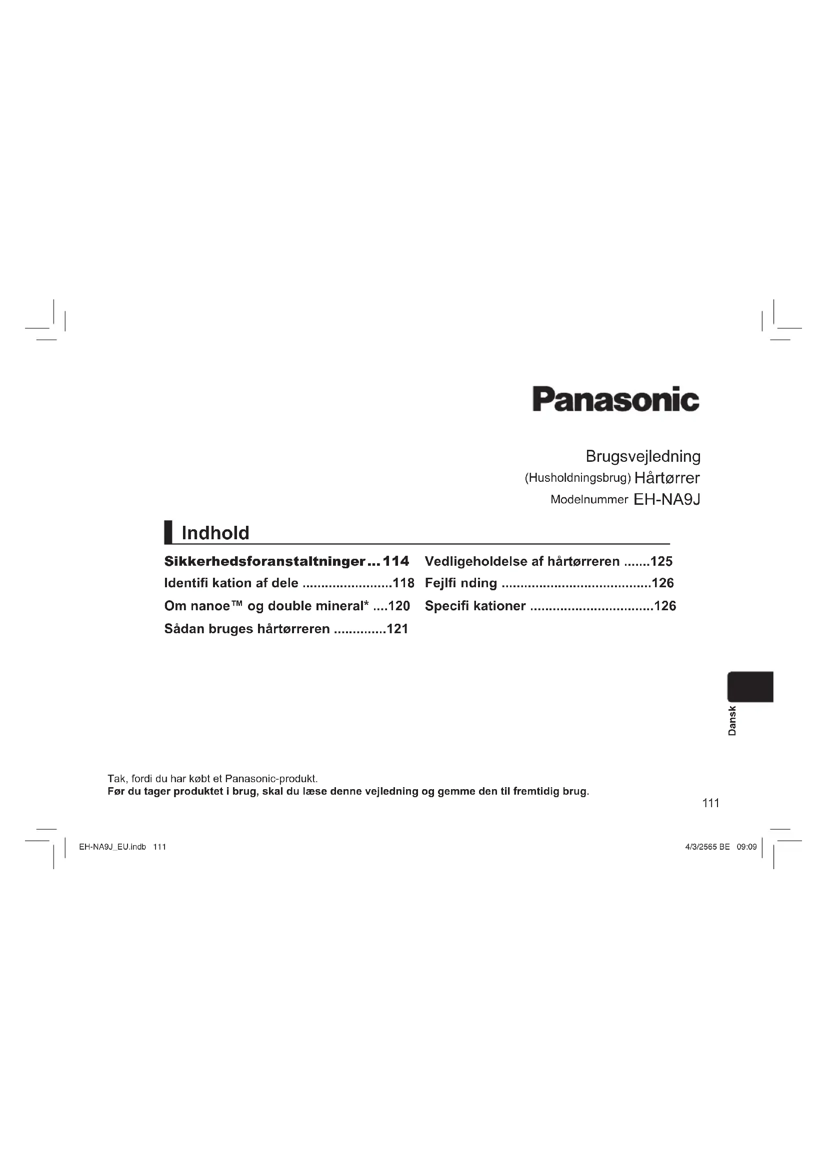 - Efterlad ikke apparatet med hårstylingprodukter eller kosmetik på det. Dette kan medføre forringelse af plastikken, hvilket kan føre til misfarvning og revner. alcoholpolish remover EH-NA9J_EU.indb 125EH-NA9J_EU.indb 125 4/3/2565 BE 09:094/3/2565 BE 09:09126 Dansk Fejlfi nding Problem Mulig årsag Tiltag Der kan ses gnister indvendigt i apparatet ved brug af [HOT]. (Disse gnister forårsages af termostatkontakten, der er den beskyttende enhed, og er ikke farlige). Der sidder støv fast i luftindgangen eller luftudgangen. Hår eller noget andet blokerer luftindgangen. Fjern det støv, der sidder fast. (Se side 125.) Varm luft bliver gentagende gange til kold luft. Bloker ikke luftindgangen. Varm luft er usædvanlig varmt. Strømstikket er usædvanlig varmt. Strømstikket er ikke sat helt i stikkontakten. Brug en stikkontakt, som strømstikket passer stramt i. Der genereres gnister inde i nanoe™-udgangen. Den nåleformede del på bagsiden af nanoe™-udgangen er beskidt. Udfør vedligeholdelse på nanoe™-udgangen. (Se side 125.) Der høres en lyd (knitren) indvendigt i nanoe™- udgangen. Der er en underligt lugt. Dette er, fordi nanoe™ og mineral-ion producerer en særlig lugt. Det er ikke farligt for kroppen. Der fl yver vanddråber ud fra nanoe™- udgangen. Der kan strømme vanddråber ud af nanoe™-udløbet, når der genereres nanoe™. Dette er ikke en fejl. Lampen [HOT] blinker hurtigt (to gange i sekundet). Unormal enhed. Kontakt et autoriseret servicecenter for reparation. Hvis problemerne stadigvæk ikke kan løses, skal du kontakte butikken, hvor du købte produktet, eller et servicecenter autoriseret af Panasonic med henblik på reparation. Specifi kationer Produktmodel EH-NA9J Strømkilde 220 V