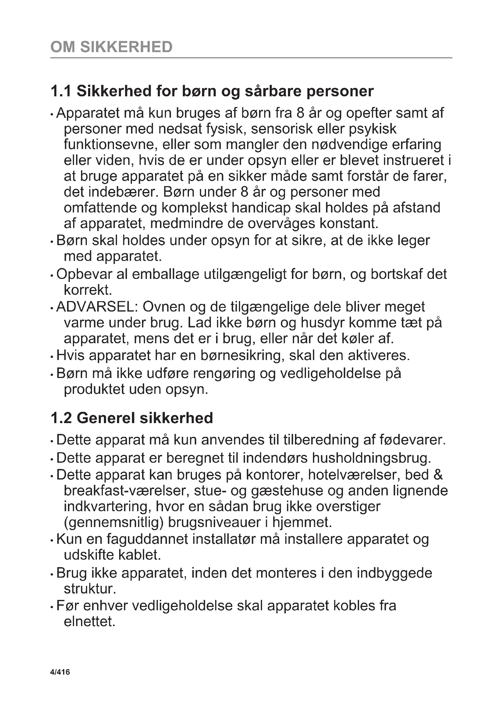 Læs brugsanvisningen grundigt, før apparatet installeres og tages i brug. Producenten påtager sig intet ansvar for eventuelle skader, der er resultatet af forkert installation eller brug. Opbevar altid brugsanvisningen på et sikkert og tilgængeligt sted til senere opslag. 3/416 OM SIKKERHED1.1 Sikkerhed for børn og sårbare personer
