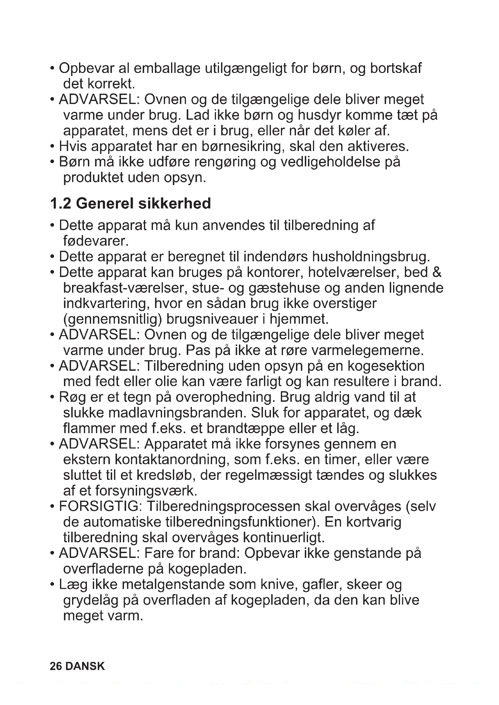 - ADVARSEL: Ovnen og de tilgængelige dele bliver meget varme under brug. Lad ikke børn og husdyr komme tæt på apparatet, mens det er i brug, eller når det køler af.