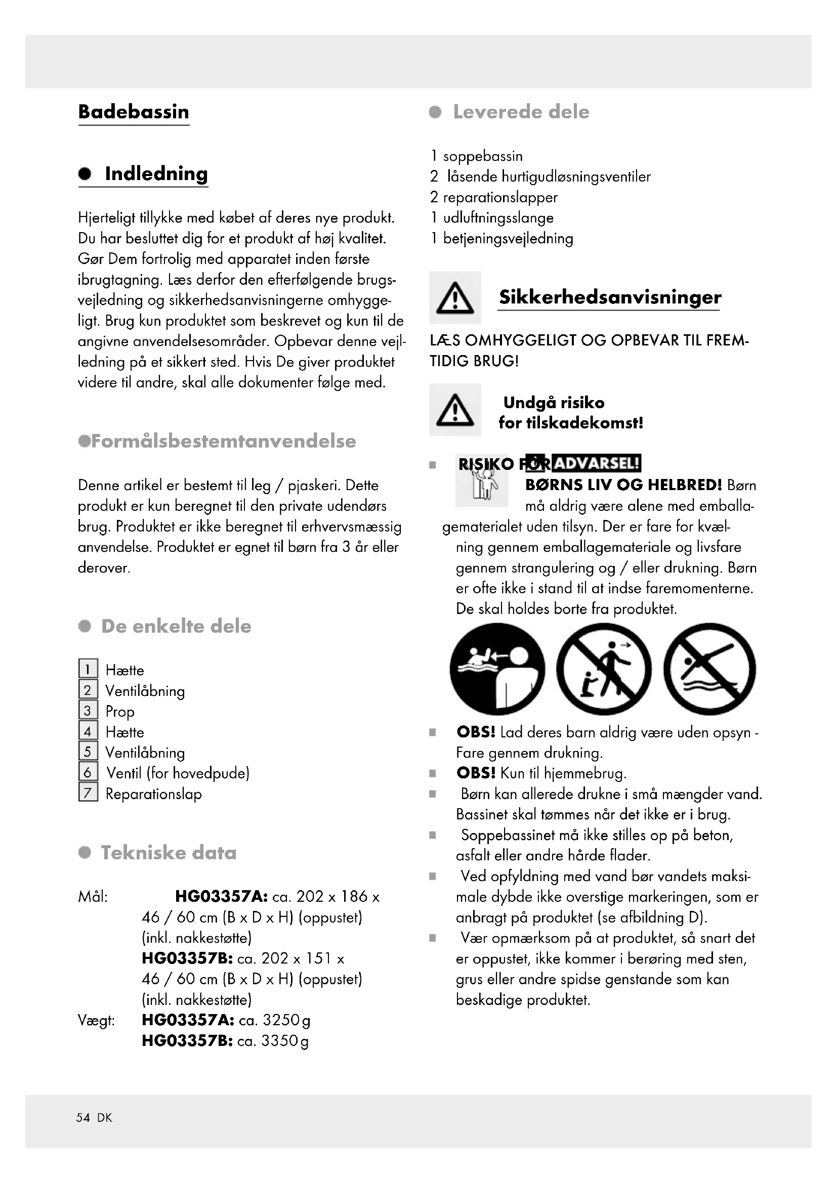 Reparationslap Tekniske data Mål: HG03357A: ca. 202 x 186 x 46 / 60 cm (B x D x H) (oppustet) (inkl. nakkestøtte) HG03357B: ca. 202 x 151 x 46 / 60 cm (B x D x H) (oppustet) (inkl. nakkestøtte) Vægt: HG03357A: ca. 3250 g HG03357B: ca. 3350 g Leverede dele 1 soppebassin 2 låsende hurtigudløsningsventiler 2 reparationslapper 1 udluftningsslange 1 betjeningsvejledning Sikkerhedsanvisninger LÆS OMHYGGELIGT OG OPBEVAR TIL FREM- TIDIG BRUG! Undgå risiko for tilskadekomst! RISIKO FOR BØRNS LIV OG HELBRED! Børn må aldrig være alene med emballa- gematerialet uden tilsyn. Der er fare for kvæl- ning gennem emballagemateriale og livsfare gennem strangulering og / eller drukning. Børn er ofte ikke i stand til at indse faremomenterne. De skal holdes borte fra produktet.