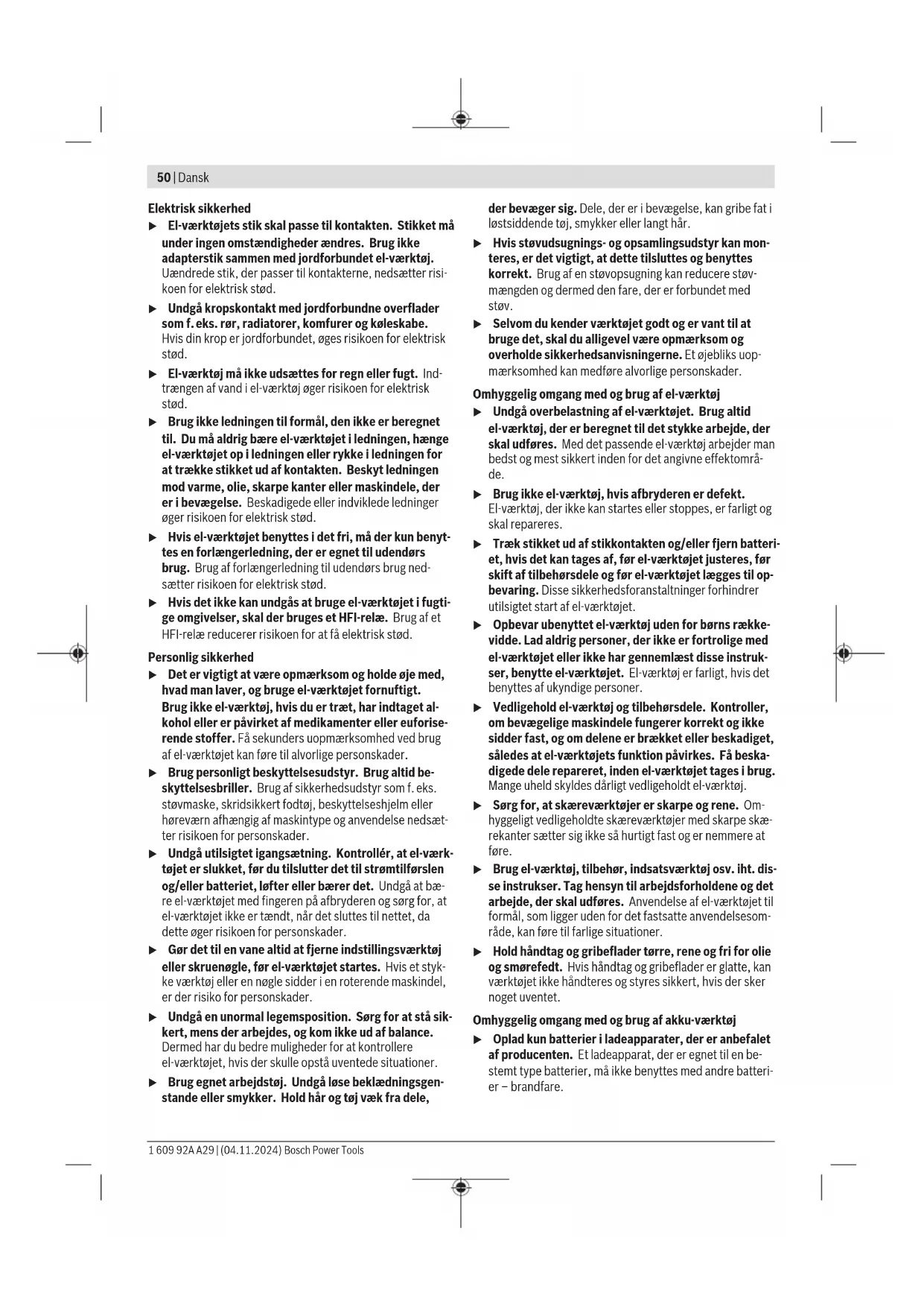 (4) Akku-udløserknap (5) Akku-ladetilstandsindikator (6) Indstillingshjul til forvalg af frekvens (7) Svingfødder (8) Fordybning til svingfødder (9) Kvadratisk grundplade til fastgørelse af klemmer (10) Kvadratisk skumstofplade med burrebåndsfastgø- relse (11) Skruer til bundplade (4x) (12) Rektangulær grundplade (13) Rektangulær skumstofplade med burrebåndsfastgø- relse (14) Trekantet grundplade (15) Trekantet skumstofplade med burrebåndsfastgørelse (16) Håndgreb (isoleret grebsflade) (17) Slibeblad med burrebåndsfastgørelse (18) Forreste klemmeliste (19) Klembøjle (2x) (20) Bageste klemmeliste (21) Udblæsningsstuds (22) Støvpose Bosch Power Tools 1 609 92A A29 | (04.11.2024)52 | Dansk (23) Adapter til støvpose (24) Udsugningsslange