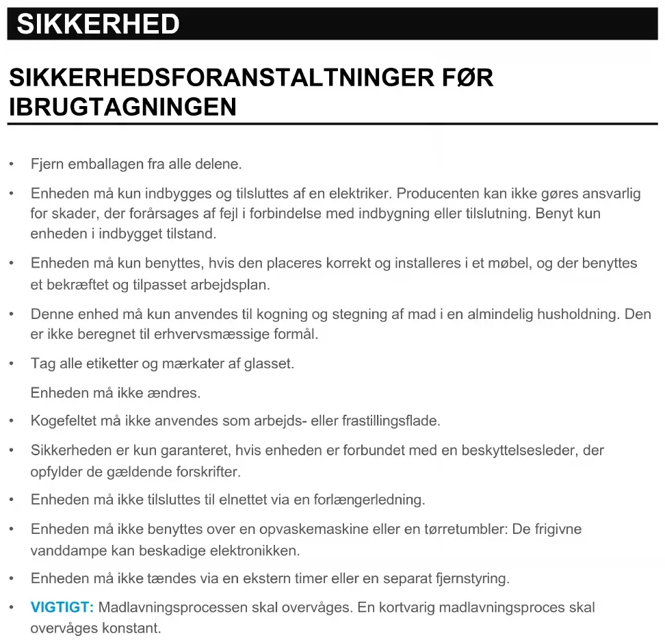 - VIGTIGT: Madlavningsprocessen skal overvåges. En kortvarig madlavningsproces skal overvåges konstant.4 GENERELLE SIKKERHEDSANVISNINGER
