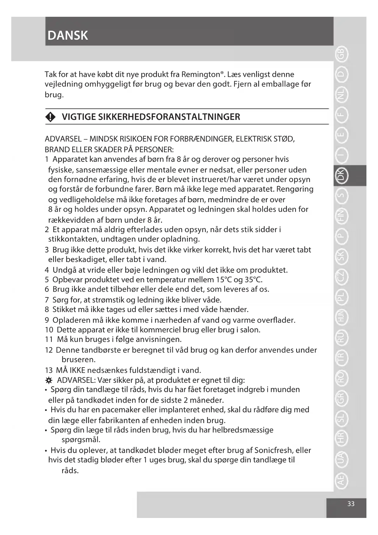 ADVARSEL – MINDSK RISIKOEN FOR FORBRÆNDINGER, ELEKTRISK STØD, BRAND ELLER SKADER PÅ PERSONER: 1 Apparatet kan anvendes af børn fra 8 år og derover og personer hvis fysiske, sansemæssige eller mentale evner er nedsat, eller personer uden den fornødne erfaring, hvis de er blevet instrueret/har været under opsyn og forstår de forbundne farer. Børn må ikke lege med apparatet. Rengøring og vedligeholdelse må ikke foretages af børn, medmindre de er over 8 år og holdes under opsyn. Apparatet og ledningen skal holdes uden for rækkevidden af børn under 8 år. 2 Et apparat må aldrig efterlades uden opsyn, når dets stik sidder i stikkontakten, undtagen under opladning. 3 Brug ikke dette produkt, hvis det ikke virker korrekt, hvis det har været tabt eller beskadiget, eller tabt i vand. 4 Undgå at vride eller bøje ledningen og vikl det ikke om produktet. 5 Opbevar produktet ved en temperatur mellem 15°C og 35°C. 6 Brug ikke andet tilbehør eller dele end det, som leveres af os. 7 Sørg for, at strømstik og ledning ikke bliver våde. 8 Stikket må ikke tages ud eller sættes i med våde hænder. 9 Opladeren må ikke komme i nærheden af vand og varme overader. 10 Dette apparat er ikke til kommerciel brug eller brug i salon. 11 Må kun bruges i følge anvisningen. 12 Denne tandbørste er beregnet til våd brug og kan derfor anvendes under bruseren. 13 MÅ IKKE nedsænkes fuldstændigt i vand. , ADVARSEL: Vær sikker på, at produktet er egnet til dig:
