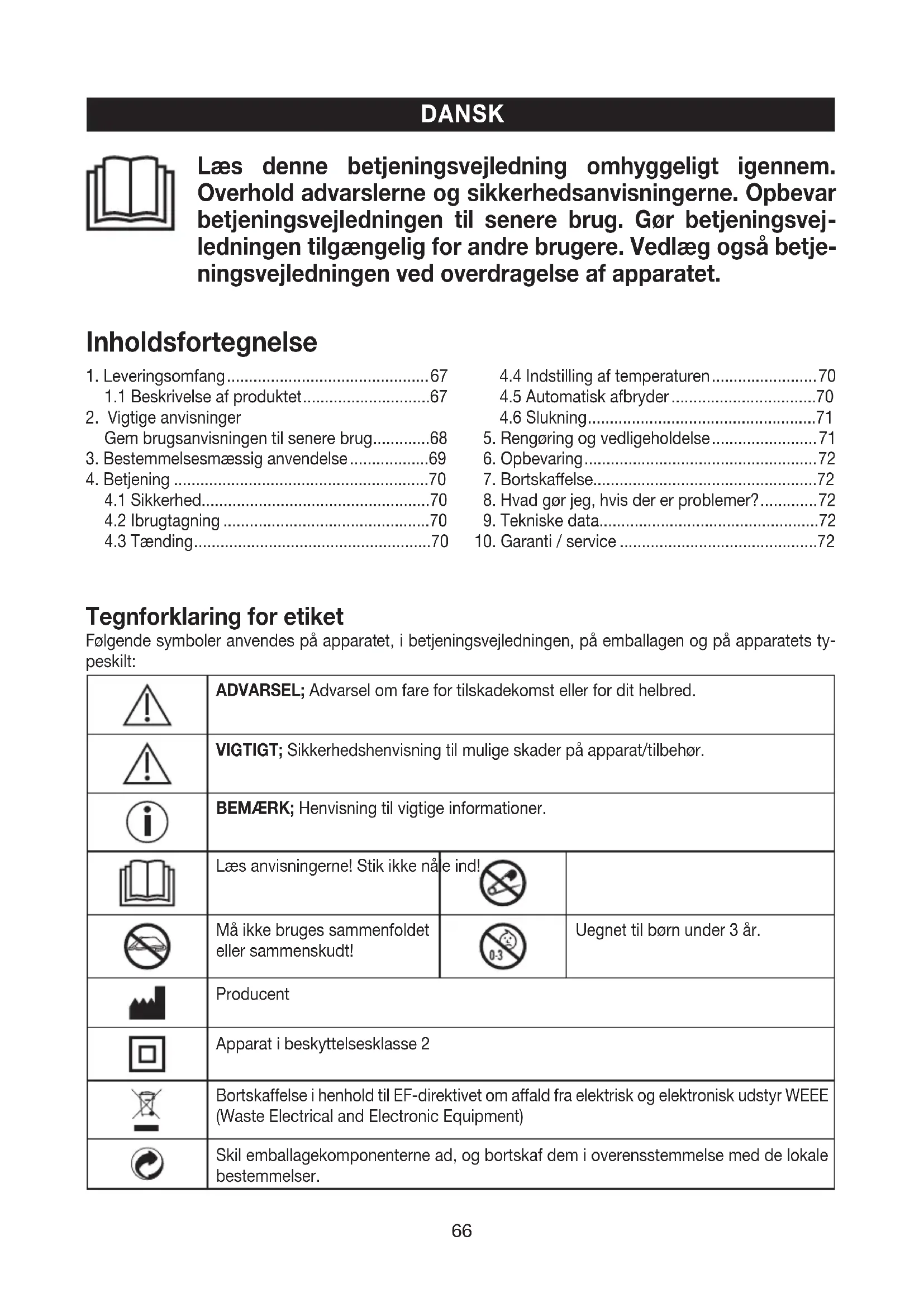 Meer informatie over de garantie en de garantievoorwaarden vindt u in het meegeleverde garantieblad. Fouten en wijzigingen voorbehouden66 Tegnforklaring for etiket Følgende symboler anvendes på apparatet, i betjeningsvejledningen, på emballagen og på apparatets ty- peskilt: ADVARSEL; Advarsel om fare for tilskadekomst eller for dit helbred. VIGTIGT; Sikkerhedshenvisning til mulige skader på apparat/tilbehør. BEMÆRK; Henvisning til vigtige informationer. Læs anvisningerne! Stik ikke nåle ind! Må ikke bruges sammenfoldet eller sammenskudt! Uegnet til børn under 3år. Producent Apparat i beskyttelsesklasse 2 Bortskaffelse i henhold til EF-direktivet om affald fra elektrisk og elektronisk udstyr WEEE (Waste Electrical and Electronic Equipment) Skil emballagekomponenterne ad, og bortskaf dem i overensstemmelse med de lokale bestemmelser.
