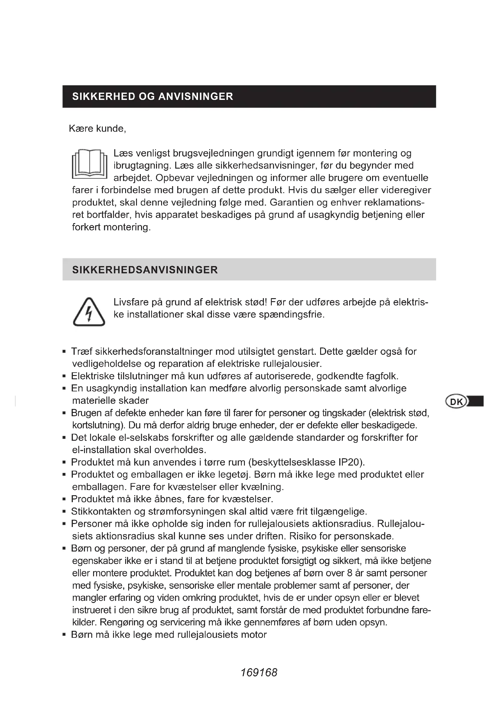 Kære kunde, Læs venligst brugsvejledningen grundigt igennem før montering og ibrugtagning. Læs alle sikkerhedsanvisninger, før du begynder med arbejdet. Opbevar vejledningen og informer alle brugere om eventuelle farer i forbindelse med brugen af dette produkt Hvis du sælger eller videregiver produktet, skal denne vejledning følge med. Garantien og enhver reklamations- ret bortfalder, hvis apparatet beskadiges på grund af usagkyndig betjening eller forkert montering SIKKERHEDSANVISNINGER Livsfare på grund af elektrisk stød! Før der udføres arbejde på elektris- ke installationer skal disse være spændingsfrie Træf sikkerhedsforanstaltninger mod utilsigtet genstart Dette gælder også for vedligeholdelse og reparation af elektriske rullejalousier. Elektriske tilslutninger må kun udføres af autoriserede, godkendte fagfolk. En usagkyndig installation kan medføre alvorlig personskade samt alvorlige materielle skader Brugen af defekte enheder kan føre til farer for personer og tingskader (elektrisk stød, kortslutning). Du må derfor aldrig bruge enheder, der er defekte eller beskadigede. Det lokale el-selskabs forskrifter og alle gældende standarder og forskrifter for el-installation skal overholdes. Produktet må kun anvendes i tørre rum (beskyttelsesklasse IP20). Produktet og emballagen er ikke legetøj. Børn må ikke lege med produktet eller emballagen Fare for kvæstelser eller kvælning Produktet må ikke åbnes, fare for kvæstelser. Stikkontakten og strømforsyningen skal altid være frit tilgængelige Personer må ikke opholde sig inden for rullejalousiets aktionsradius. Rullejalou- siets aktionsradius skal kunne ses under driften. Risiko for personskade. Børn og personer, der på grund af manglende fysiske, psykiske eller sensoriske egenskaber ikke er i stand til at betjene produktet forsigtigt og sikkert, må ikke betjene eller montere produktet. Produktet kan dog betjenes af børn over 8 år samt personer med fysiske, psykiske, sensoriske eller mentale problemer samt af personer, der mangler erfaring og viden omkring produktet, hvis de er under opsyn eller er blevet instrueret i den sikre brug af produktet, samt forstår de med produktet forbundne fare- kilder. Rengøring og servicering må ikke gennemføres af børn uden opsyn. Børn må ikke lege med rullejalousiets motor170