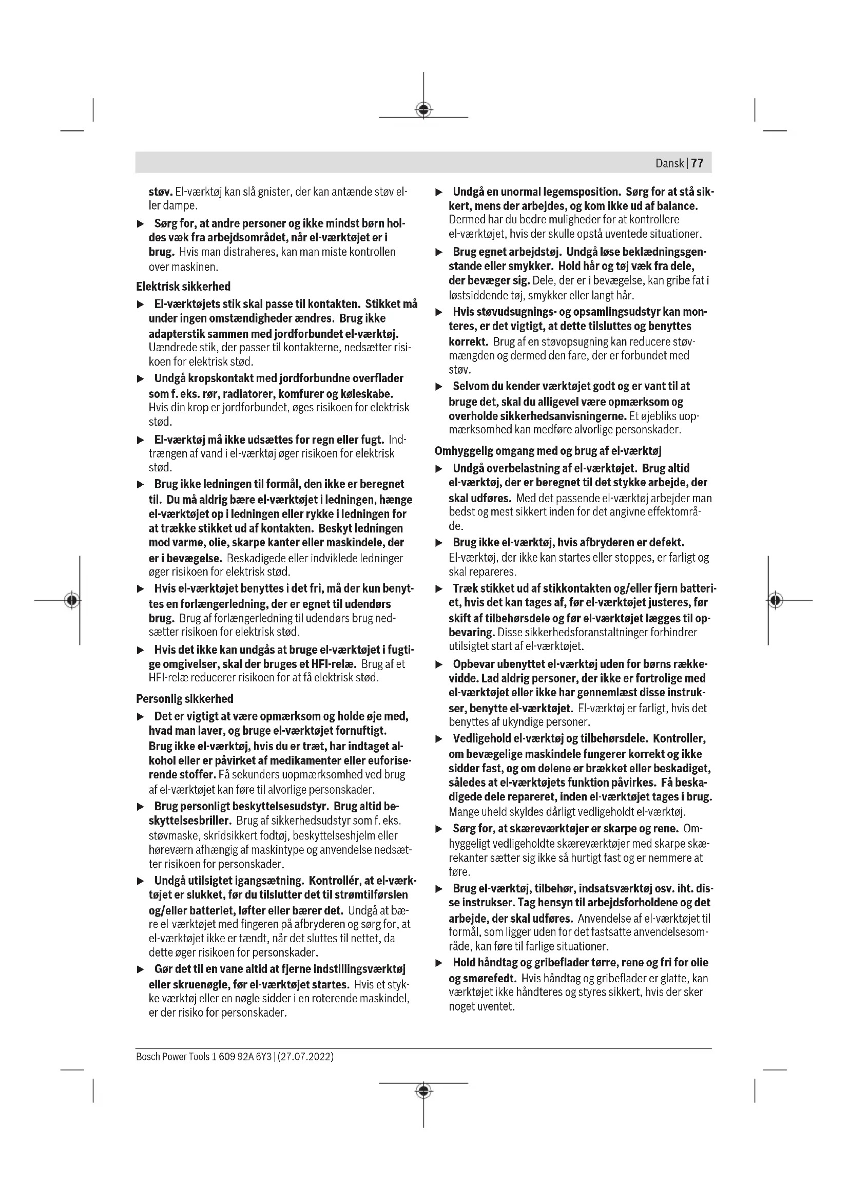fly. Undgå at bruge værktøjet i umiddelbar nærhed af kroppen i længere tid ad gangen. Mærket Bluetooth® og symbolerne (logoerne) er registre- rede varemærker tilhørende Bluetooth SIG, Inc. Enhver brug af disse mærker/symboler, som Robert Bosch Po- wer Tools GmbH foretager, sker per licens. 1 609 92A 6Y3 | (27.07.2022) Bosch Power ToolsDansk | 79 Produkt- og ydelsesbeskrivelse Læs alle sikkerhedsinstrukser og anvisnin- ger. Overholdes sikkerhedsinstrukserne og an- visningerne ikke, er der risiko for elektrisk stød, brand og/eller alvorlige kvæstelser. Vær opmærksom på alle illustrationer i den forreste del af betjeningsvejledningen. Beregnet anvendelse El-værktøjet er beregnet til – på et fast underlag – at udføre gennemskæringer, udsnit i træ, plast, metal, keramikplader, gummi og laminat/HPL (High Pressure Laminate). Det er eg- net til ligesnit og kurvesnit. Benyt de anbefalede savklinger. Via det integrerede Bluetooth