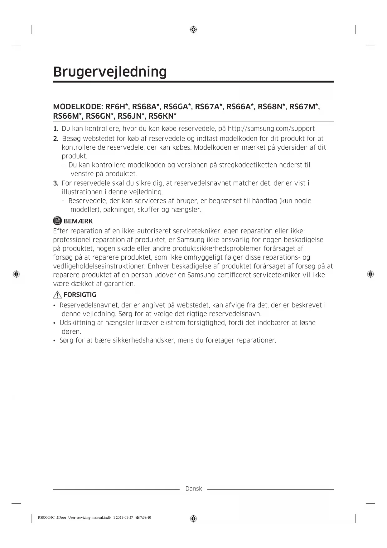 - Sørg for at bære sikkerhedshandsker, mens du foretager reparationer. RS8000NC_2Door_User-servicing-manual.indb 1 2021-01-27 7:39:40Dansk Det faktiske billede og køleskabets medfølgende dele afviger muligvis afhængigt af model og land.