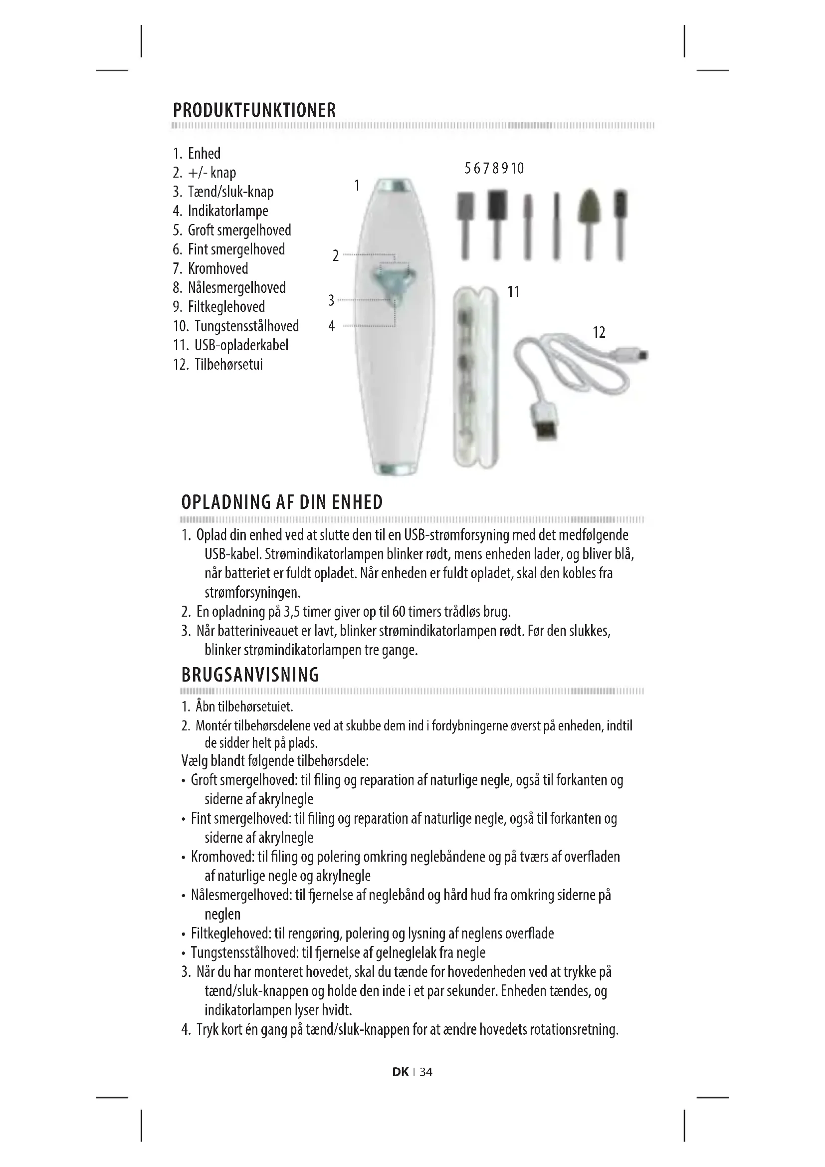 den inde, indtil motoren stopper. Efter rengøring af hovederne skal du opbevare dem i tilbehørsetuiet.