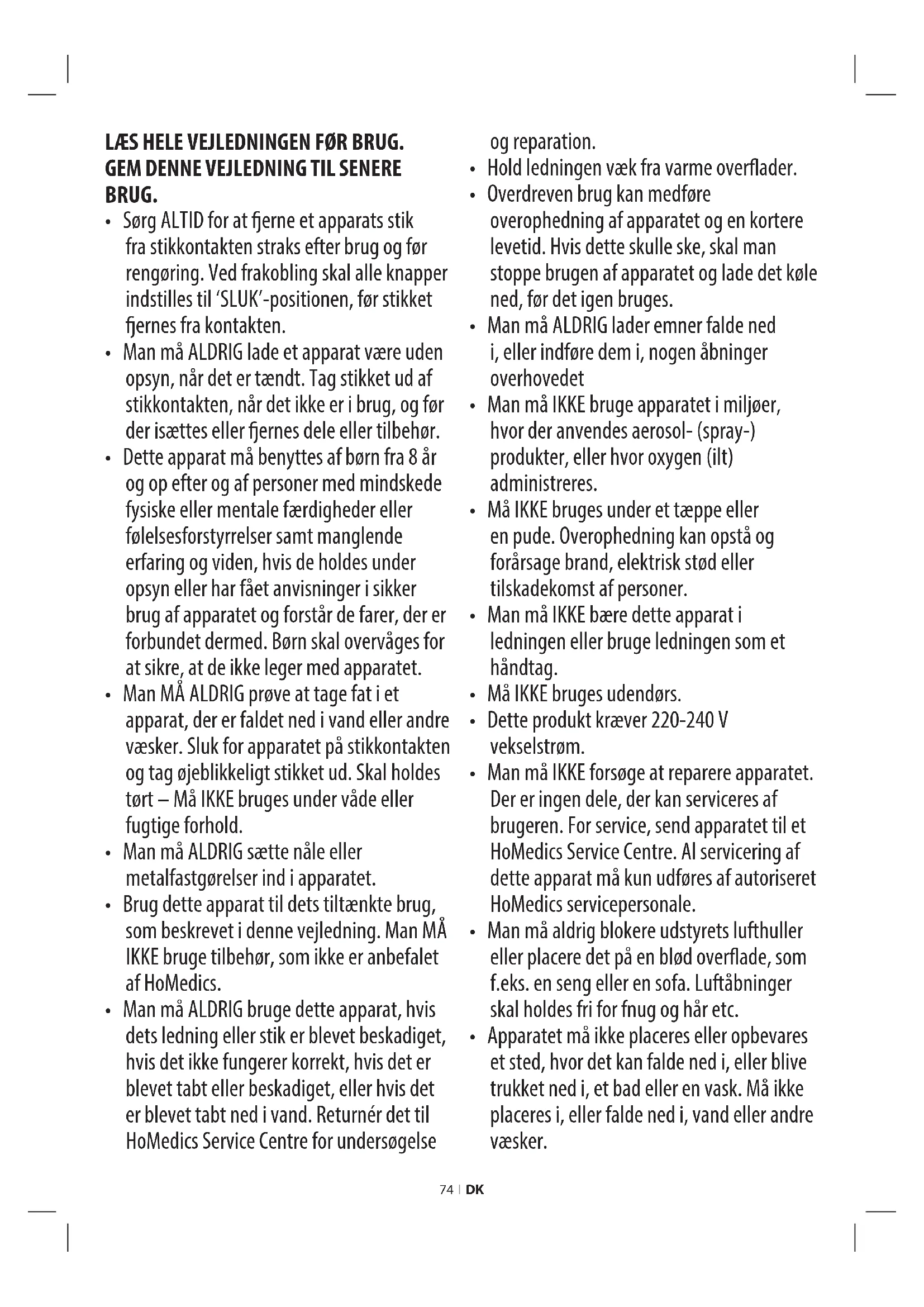 - Man må IKKE forsøge at reparere apparatet. Der er ingen dele, der kan serviceres af brugeren. For service, send apparatet til et HoMedics Service Centre. Al servicering af dette apparat må kun udføres af autoriseret HoMedics servicepersonale.