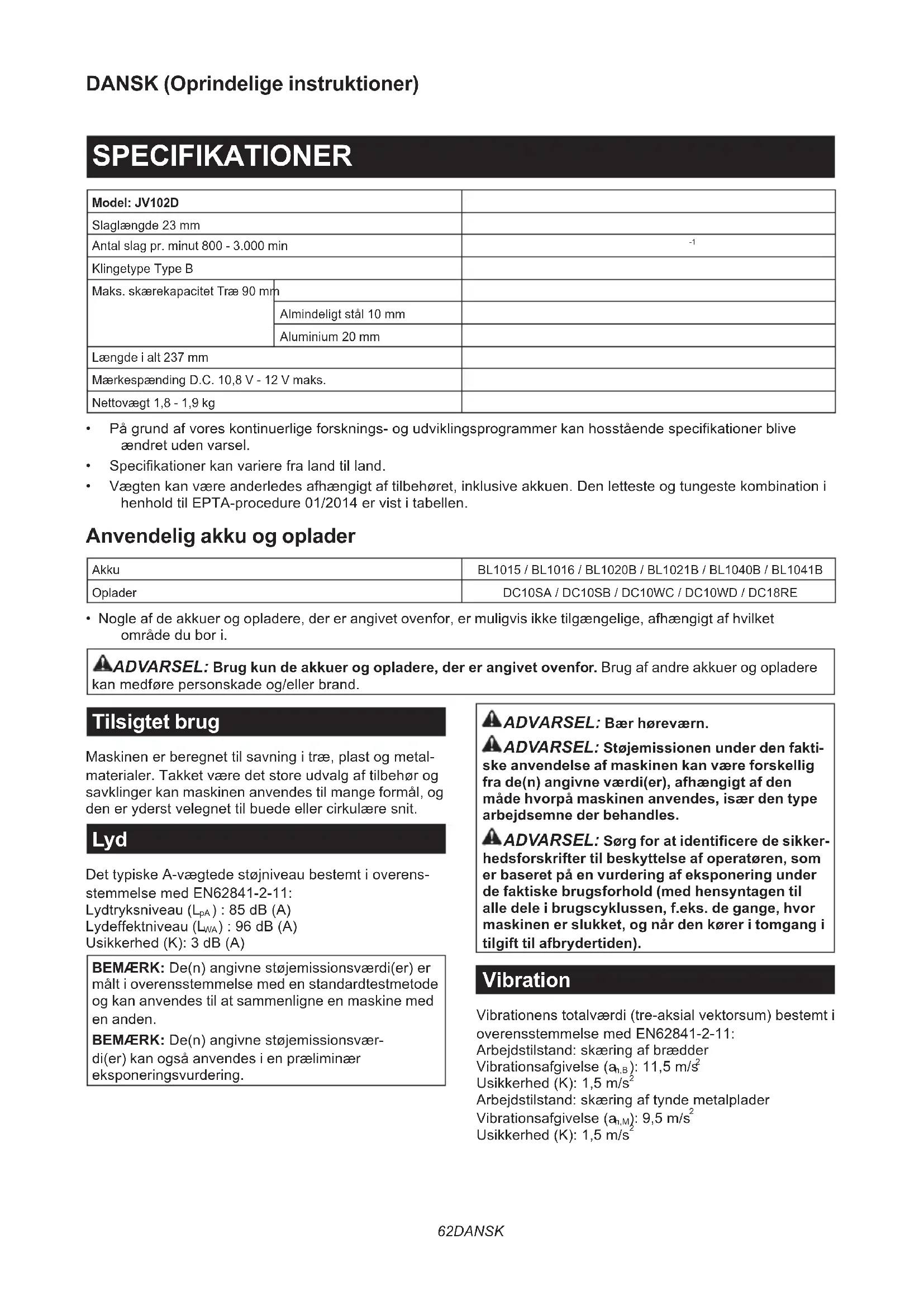- Nogle af de akkuer og opladere, der er angivet ovenfor, er muligvis ikke tilgængelige, afhængigt af hvilket områdedubori. ADVARSEL: Brug kun de akkuer og opladere, der er angivet ovenfor. Brug af andre akkuer og opladere kanmedførepersonskadeog/ellerbrand. Tilsigtet brug Maskinenerberegnettilsavningitræ,plastogmetal- materialer.Takketværedetstoreudvalgaftilbehørog savklinger kan maskinen anvendes til mange formål, og deneryderstvelegnettilbuedeellercirkulæresnit. Lyd DettypiskeA-vægtedestøjniveaubestemtioverens- stemmelsemedEN62841-2-11: Lydtryksniveau (L