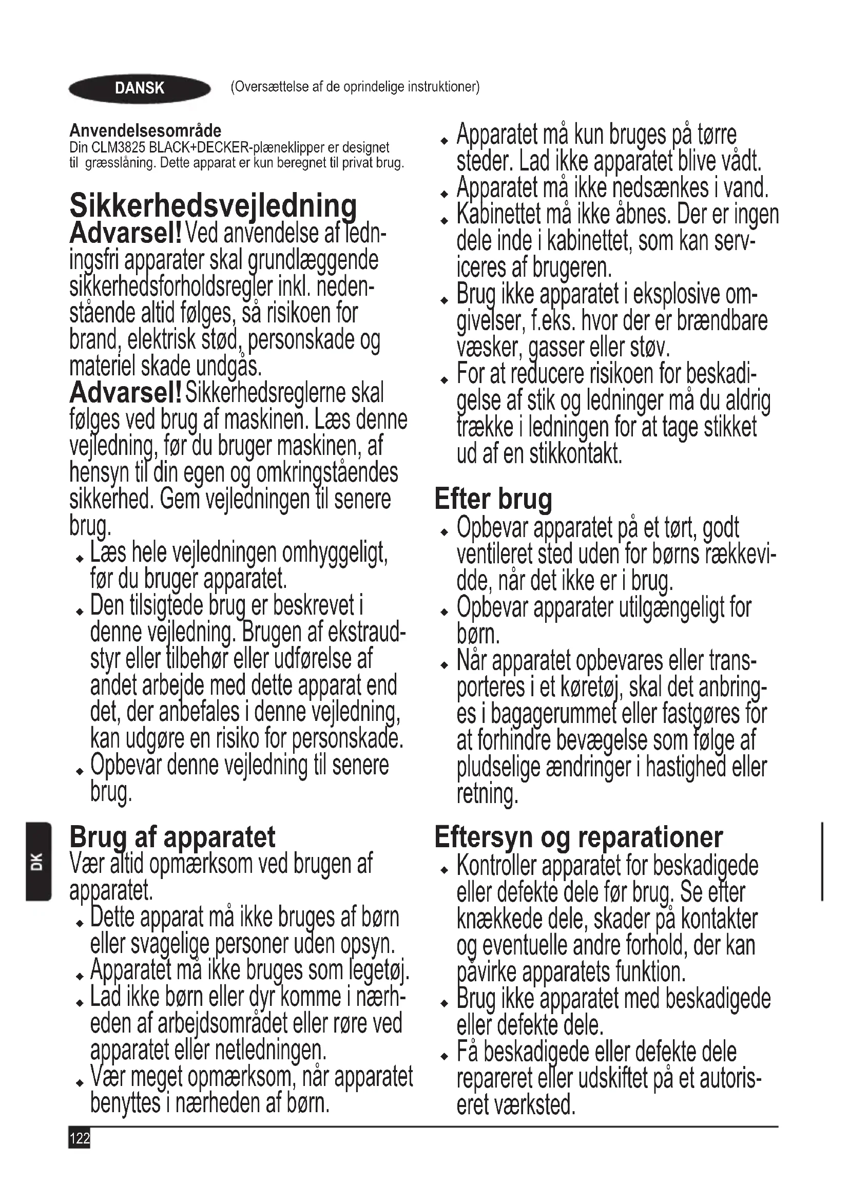 (garanteret lydeffekt) 96 dB(A) (Oversættelse af de oprindelige instruktioner) DANSK EN 60335-2-77:2010 Disse produkter er endvidere i overensstemmelse med direktiv 2004/108/EF (indtil 19/04/2016) 2014/30/EU (fra 20/04/2016) og 2011/65/EU. Kontakt Black & Decker på nedenstående adresse eller se Undertegnede er ansvarlig for udarbejdelsen af de tekniske data og fremsætter denne erklæring på vegne af Black & Decker Europe. R.Laverick Engineering Manager Black & Decker Europe, 210 Bath Road, Slough, Berkshire, SL1 3YD Storbritannien 28/09/2015133 Garanti Black & Decker garanterer, at produktet er fri for skader og fejl og tilbyder en fremragende garanti. Garantien er et tillæg til forbrugerens lovsikrede rettigheder og påvirker ikke disse. Ga- rantien gælder inden for medlemsstaterne af den Europæiske Union og i det Europæiske Frihandelsområde. Hvis et Black & Decker-produkt går i stykker på grund af materiel skade og/eller fabrikationsfejl eller på anden måde for 24 måneder fra købsdatoen, påtager Black & Decker sig at reparere eller ombytte produktet med mindst mulig ulempe for kunden. Garantien gælder ikke for fejl og mangler, der er sket i forbindelse med: Produktet har været anvendt erhvervsmæssigt eller til udlejning. Produktet har været anvendt forkert eller er ikke vedlige- holdt. Produktet er beskadiget af fremmedlegemer, substanser eller pga. uheld. Garantien gælder ikke, hvis reparationer er udført af andre end et autoriseret Black & Decker-værksted. For at udnytte garantien skal produktet og købskvitteringen indleveres til forhandleren eller til et autoriseret værksted. Kontakt det lokale Black & Decker-kontor på den adresse, der er opgivet i denne vejledning, for at få oplysninger om nærmeste autoriserede værksted. En liste over alle autoris- erede Black & Decker-serviceværksteder samt servicevilkår og kontaktpersoner er tilgængelig på internettet på adressen: www.2helpU.com Gå venligst ind på vores website www.blackanddecker.dk for at registrere dit nye produkt og for at blive holdt ajour om nye om mærket BLACK+DECKER og vores produktsortiment på adressen www.blackanddecker.dk (Oversættelse af de oprindelige instruktioner) DANSK134 Käyttötarkoitus BLACK+DECKER -ruohonleikkuri CLM3825 on suunniteltu ruohon leikkaamiseen. Laite on tarkoitettu vain yksityiskäyttöön. Turvallisuusohjeet Varoitus! Johdottomia laitteita käytettäessä on aina noudatettava asianmukaisia turvaohjeita, jotta tulipalo- jen, sähköiskujen, henkilövahinkojen ja materiaalivaurioiden riski olisi mahdol- lisimman pieni. Varoitus! Laitetta käytettäessä on noudatettava turvallisuussääntöjä. Lue tämä opas huolellisesti läpi ennen koneen käyttöä oman ja muiden turval- lisuuden takia. Säilytä ohjeet myöhempää tarvetta varten.