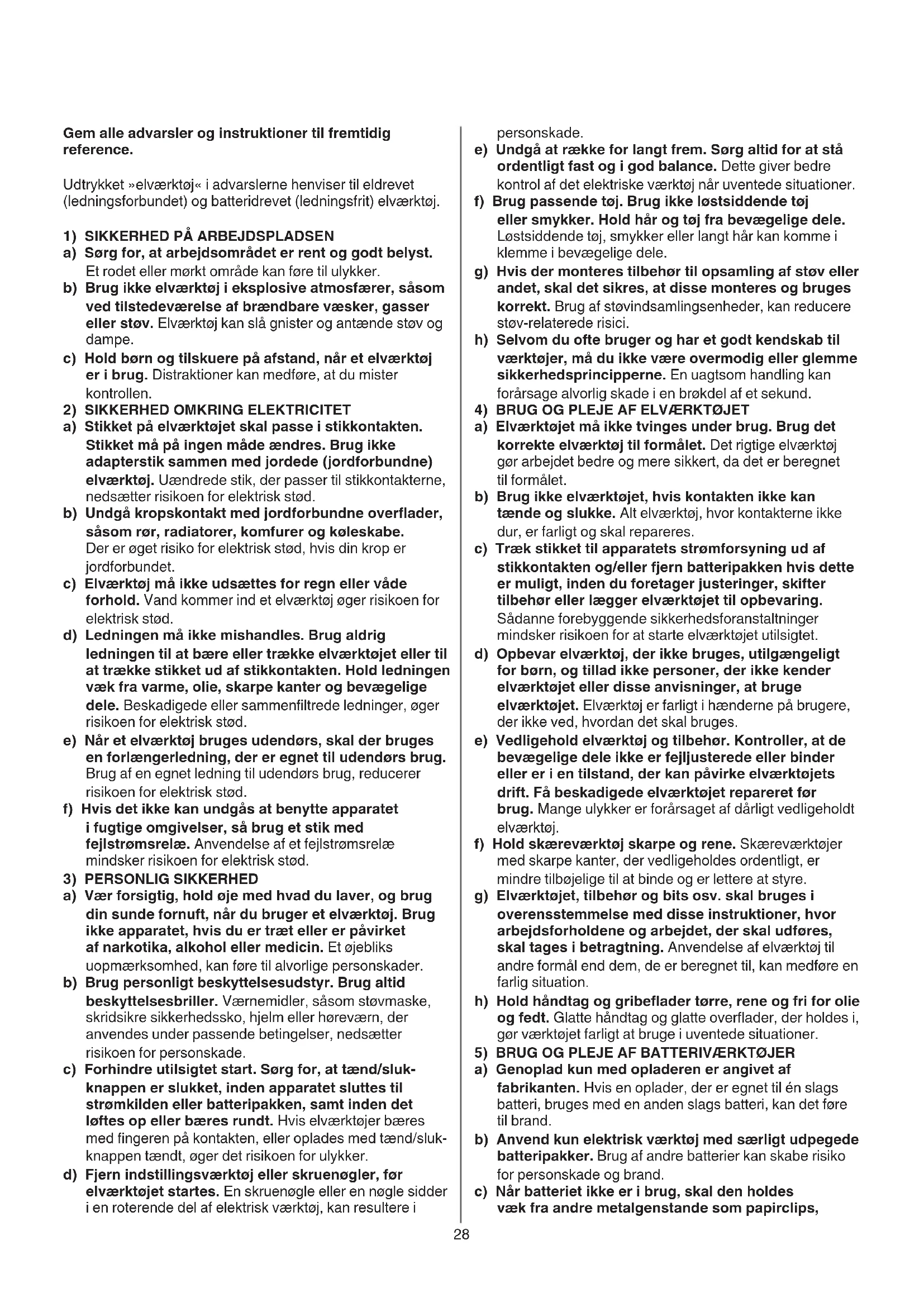 a) Genoplad kun med opladeren er angivet af fabrikanten. Hvis en oplader, der er egnet til én slags batteri, bruges med en anden slags batteri, kan det føre til brand. b) Anvend kun elektrisk værktøj med særligt udpegede batteripakker. Brug af andre batterier kan skabe risiko for personskade og brand. c) Når batteriet ikke er i brug, skal den holdes væk fra andre metalgenstande som papirclips, Gem alle advarsler og instruktioner til fremtidig reference. Udtrykket »elværktøj« i advarslerne henviser til eldrevet (ledningsforbundet) og batteridrevet (ledningsfrit) elværktøj.
