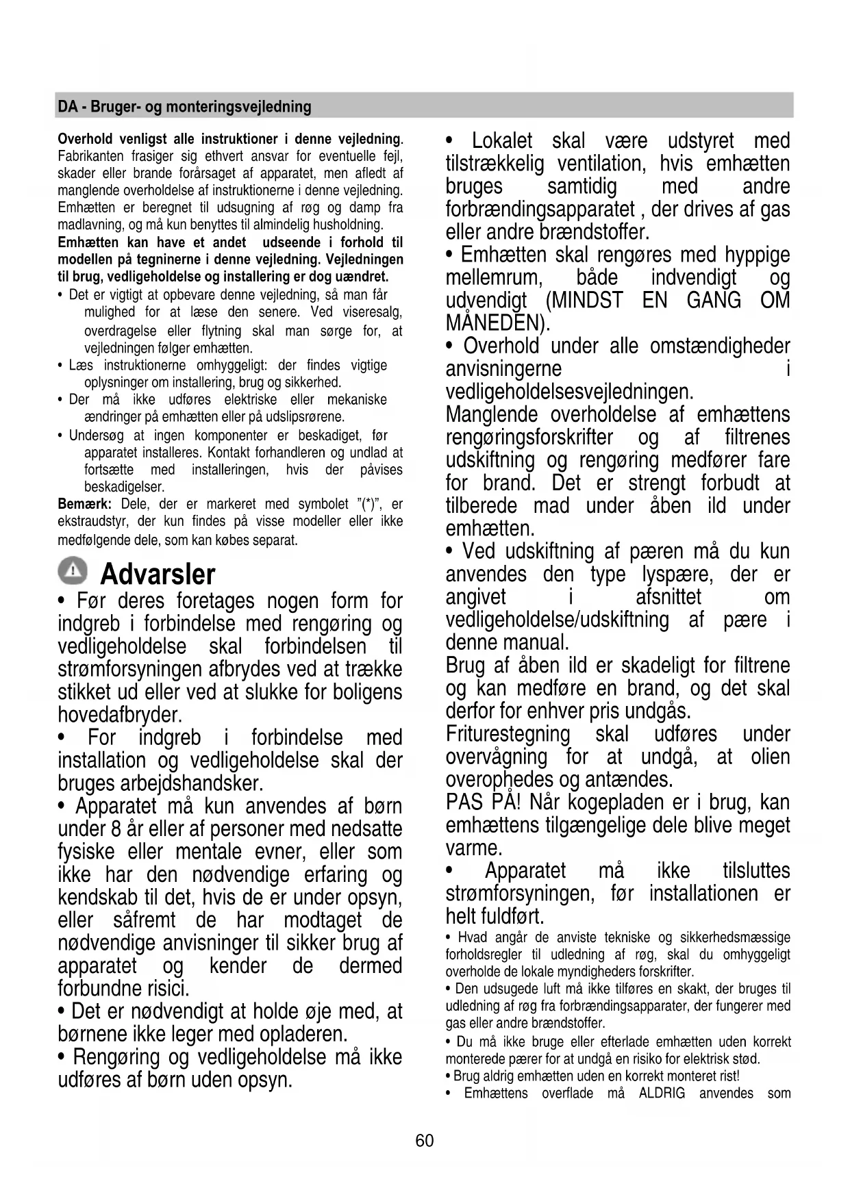 - Overhold under alle omstændigheder anvisningerne i vedligeholdelsesvejledningen. Manglende overholdelse af emhættens rengøringsforskrifter og af filtrenes udskiftning og rengøring medfører fare for brand. Det er strengt forbudt at tilberede mad under åben ild under emhætten.