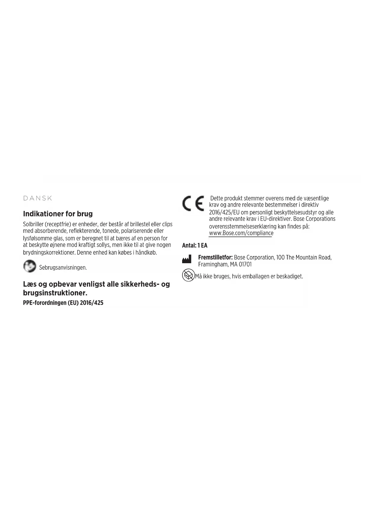 Videos Warning/CautionDANSK Indikationer for brug Solbriller (receptfrie) er enheder, der består af brillestel eller clips med absorberende, reflekterende, tonede, polariserende eller lysfølsomme glas, som er beregnet til at bæres af en person for at beskytte øjnene mod kraftigt sollys, men ikke til at give nogen brydningskorrektioner. Denne enhed kan købes i håndkøb. Se brugsanvisningen. Læs og opbevar venligst alle sikkerheds- og brugsinstruktioner. PPE-forordningen (EU) 2016/425 Dette produkt stemmer overens med de væsentlige krav og andre relevante bestemmelser i direktiv 2016/425/EU om personligt beskyttelsesudstyr og alle andre relevante krav i EU-direktiver. Bose Corporations overensstemmelseserklæring kan findes på: www.Bose.com/compliance Antal: 1 EA