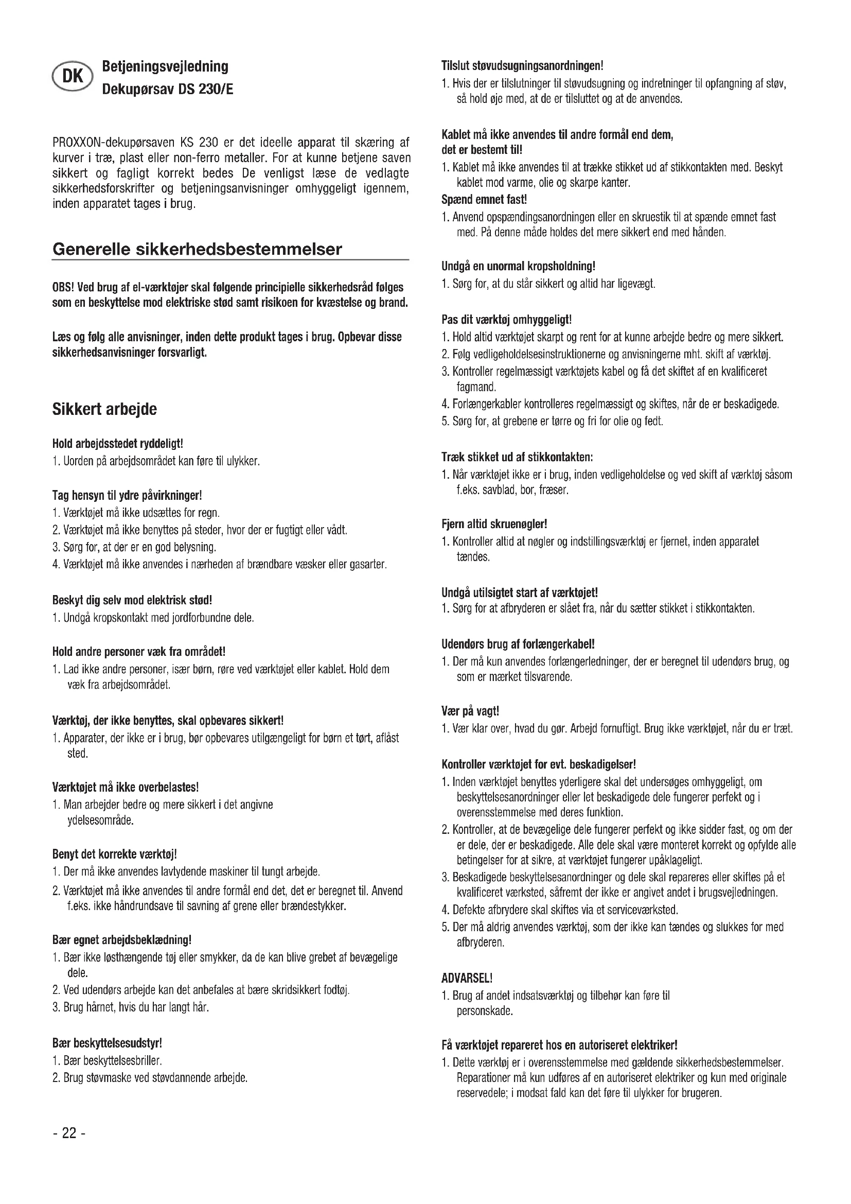 - DIN EN 61000-3-3 / 05.2002 Dipl.-Ing. Jörg Wagner PROXXON S.A. Afdeling apparaatveiligheid- 22 - Betjeningsvejledning Dekupørsav DS 230/E PROXXON-dekupørsaven KS 230 er det ideelle apparat til skæring af kurver i træ, plast eller non-ferro metaller. For at kunne betjene saven sikkert og fagligt korrekt bedes De venligst læse de vedlagte sikkerhedsforskrifter og betjeningsanvisninger omhyggeligt igennem, inden apparatet tages i brug. Generelle sikkerhedsbestemmelser OBS! Ved brug af el-værktøjer skal følgende principielle sikkerhedsråd følges som en beskyttelse mod elektriske stød samt risikoen for kvæstelse og brand. Læs og følg alle anvisninger, inden dette produkt tages i brug. Opbevar disse sikkerhedsanvisninger forsvarligt. Sikkert arbejde Hold arbejdsstedet ryddeligt!