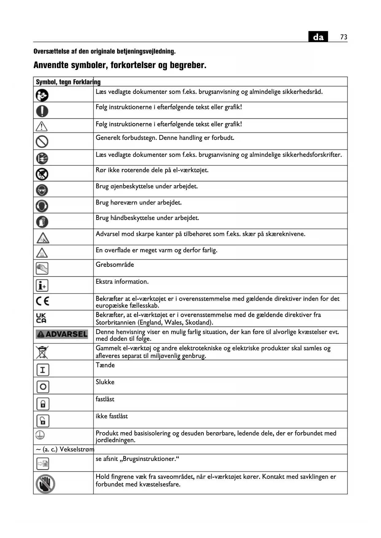 Oversættelse af den originale betjeningsvejledning. Anvendte symboler, forkortelser og begreber. Symbol, tegn Forklaring Læs vedlagte dokumenter som f.eks. brugsanvisning og almindelige sikkerhedsråd. Følg instruktionerne i efterfølgende tekst eller grafik! Følg instruktionerne i efterfølgende tekst eller grafik! Generelt forbudstegn. Denne handling er forbudt. Læs vedlagte dokumenter som f.eks. brugsanvisning og almindelige sikkerhedsforskrifter. Rør ikke roterende dele på el-værktøjet. Brug øjenbeskyttelse under arbejdet. Brug høreværn under arbejdet. Brug håndbeskyttelse under arbejdet. Advarsel mod skarpe kanter på tilbehøret som f.eks. skær på skæreknivene. En overflade er meget varm og derfor farlig. Grebsområde Ekstra information. Bekræfter at el-værktøjet er i overensstemmelse med gældende direktiver inden for det europæiske fællesskab. Bekræfter, at el-værktøjet er i overensstemmelse med de gældende direktiver fra Storbritannien (England, Wales, Skotland). Denne henvisning viser en mulig farlig situation, der kan føre til alvorlige kvæstelser evt. med døden til følge. Gammelt el-værktøj og andre elektrotekniske og elektriske produkter skal samles og afleveres separat til miljøvenlig genbrug. Tænde Slukke fastlåst ikke fastlåst Produkt med basisisolering og desuden berørbare, ledende dele, der er forbundet med jordledningen. ~ (a. c.) Vekselstrøm se afsnit „Brugsinstruktioner.“ Hold fingrene væk fra saveområdet, når el-værktøjet kører. Kontakt med savklingen er forbundet med kvæstelsesfare.74