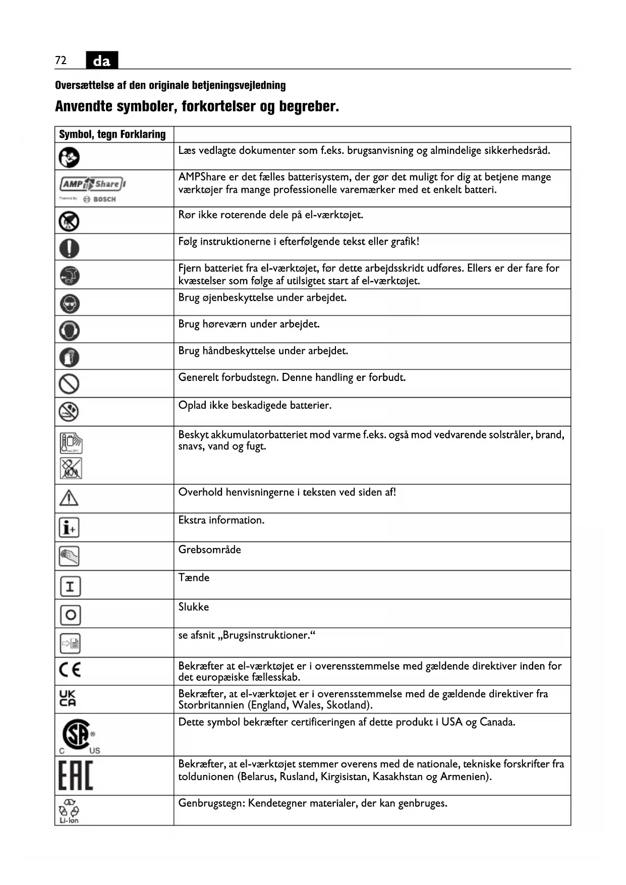 Oversættelse af den originale betjeningsvejledning Anvendte symboler, forkortelser og begreber. Symbol, tegn Forklaring Læs vedlagte dokumenter som f.eks. brugsanvisning og almindelige sikkerhedsråd. AMPShare er det fælles batterisystem, der gør det muligt for dig at betjene mange værktøjer fra mange professionelle varemærker med et enkelt batteri. Rør ikke roterende dele på el-værktøjet. Følg instruktionerne i efterfølgende tekst eller grafik! Fjern batteriet fra el-værktøjet, før dette arbejdsskridt udføres. Ellers er der fare for kvæstelser som følge af utilsigtet start af el-værktøjet. Brug øjenbeskyttelse under arbejdet. Brug høreværn under arbejdet. Brug håndbeskyttelse under arbejdet. Generelt forbudstegn. Denne handling er forbudt. Oplad ikke beskadigede batterier. Beskyt akkumulatorbatteriet mod varme f.eks. også mod vedvarende solstråler, brand, snavs, vand og fugt. Overhold henvisningerne i teksten ved siden af! Ekstra information. Grebsområde Tænde Slukke se afsnit „Brugsinstruktioner.“ Bekræfter at el-værktøjet er i overensstemmelse med gældende direktiver inden for det europæiske fællesskab. Bekræfter, at el-værktøjet er i overensstemmelse med de gældende direktiver fra Storbritannien (England, Wales, Skotland). Dette symbol bekræfter certificeringen af dette produkt i USA og Canada. Bekræfter, at el-værktøjet stemmer overens med de nationale, tekniske forskrifter fra toldunionen (Belarus, Rusland, Kirgisistan, Kasakhstan og Armenien). Genbrugstegn: Kendetegner materialer, der kan genbruges. max.50°C73
