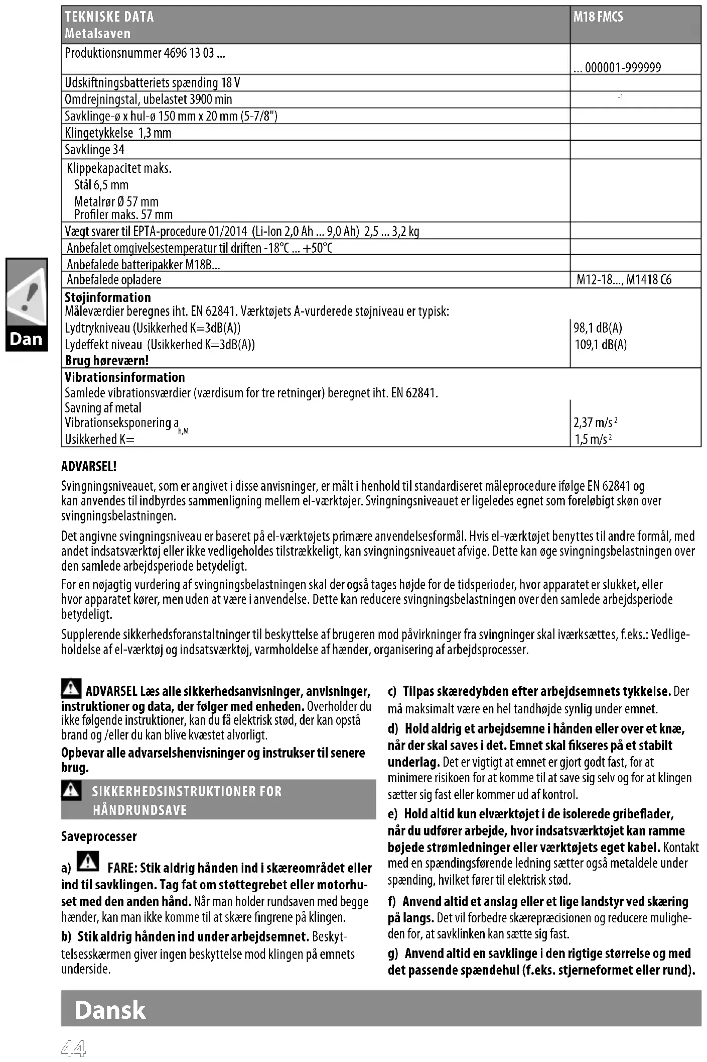 Savklinge-ø x hul-ø 150 mm x 20 mm (5-7/8") Klingetykkelse 1,3 mm Savklinge 34 Klippekapacitet maks. Stål 6,5 mm Metalrør Ø 57 mm Proler maks. 57 mm Vægt svarer til EPTA-procedure 01/2014 (Li-Ion 2,0 Ah ... 9,0 Ah) 2,5 ... 3,2 kg Anbefalet omgivelsestemperatur til driften -18°C ... +50°C Anbefalede batteripakker M18B... Anbefalede opladere M12-18..., M1418 C6 Støjinformation Måleværdier beregnes iht. EN 62841. Værktøjets A-vurderede støjniveau er typisk: Lydtrykniveau (Usikkerhed K=3dB(A)) 98,1 dB(A) Lydeekt niveau (Usikkerhed K=3dB(A)) 109,1 dB(A) Brug høreværn! Vibrationsinformation Samlede vibrationsværdier (værdisum for tre retninger) beregnet iht. EN 62841. Savning af metal Vibrationseksponering a h,M 2,37 m/s