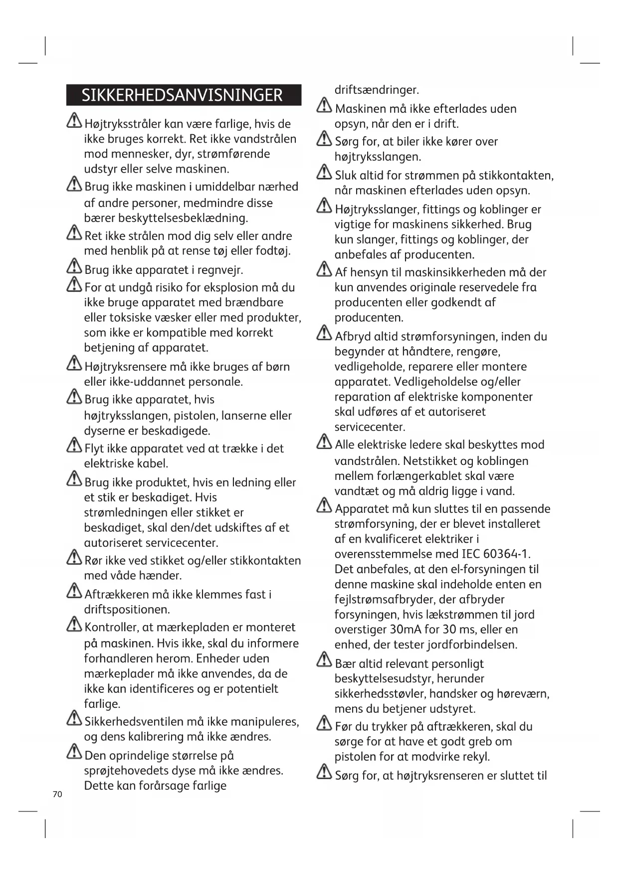 Værktøj til rengøring af dyse Sikkerhedsregler/Andre risici SYMBOLER: Læs brugsanvisningen ADVARSEL, FORSIGTIG eller FARE Elektrisk advarsel. Maskinen er ikke egnet til tilslutning til drikkevandsforsy- ningen. Ret aldrig pistolen mod mennesker, dyr, strømførende udstyr eller selve maskinen. Produktet er klassificeret i isoleringsklasse II. Dette betyder, at det har forstærket eller dobbelt isolering Dette produkt overholder de relevante EU-direktiver.70 SIKKERHEDSANVISNINGER Højtryksstråler kan være farlige, hvis de ikke bruges korrekt. Ret ikke vandstrålen mod mennesker, dyr, strømførende udstyr eller selve maskinen. Brug ikke maskinen i umiddelbar nærhed af andre personer, medmindre disse bærer beskyttelsesbeklædning. Ret ikke strålen mod dig selv eller andre med henblik på at rense tøj eller fodtøj. Brug ikke apparatet i regnvejr. For at undgå risiko for eksplosion må du ikke bruge apparatet med brændbare eller toksiske væsker eller med produkter, som ikke er kompatible med korrekt betjening af apparatet. Højtryksrensere må ikke bruges af børn eller ikke-uddannet personale. Brug ikke apparatet, hvis højtryksslangen, pistolen, lanserne eller dyserne er beskadigede. Flyt ikke apparatet ved at trække i det elektriske kabel. Brug ikke produktet, hvis en ledning eller et stik er beskadiget. Hvis strømledningen eller stikket er beskadiget, skal den/det udskiftes af et autoriseret servicecenter. Rør ikke ved stikket og/eller stikkontakten med våde hænder. Aftrækkeren må ikke klemmes fast i driftspositionen. Kontroller, at mærkepladen er monteret på maskinen. Hvis ikke, skal du informere forhandleren herom. Enheder uden mærkeplader må ikke anvendes, da de ikke kan identificeres og er potentielt farlige. Sikkerhedsventilen må ikke manipuleres, og dens kalibrering må ikke ændres. Den oprindelige størrelse på sprøjtehovedets dyse må ikke ændres. Dette kan forårsage farlige driftsændringer. Maskinen må ikke efterlades uden opsyn, når den er i drift. Sørg for, at biler ikke kører over højtryksslangen. Sluk altid for strømmen på stikkontakten, når maskinen efterlades uden opsyn. Højtryksslanger, fittings og koblinger er vigtige for maskinens sikkerhed. Brug kun slanger, fittings og koblinger, der anbefales af producenten. Af hensyn til maskinsikkerheden må der kun anvendes originale reservedele fra producenten eller godkendt af producenten. Afbryd altid strømforsyningen, inden du begynder at håndtere, rengøre, vedligeholde, reparere eller montere apparatet. Vedligeholdelse og/eller reparation af elektriske komponenter skal udføres af et autoriseret servicecenter. Alle elektriske ledere skal beskyttes mod vandstrålen. Netstikket og koblingen mellem forlængerkablet skal være vandtæt og må aldrig ligge i vand. Apparatet må kun sluttes til en passende strømforsyning, der er blevet installeret af en kvalificeret elektriker i overensstemmelse med IEC 60364-1. Det anbefales, at den el-forsyningen til denne maskine skal indeholde enten en fejlstrømsafbryder, der afbryder forsyningen, hvis lækstrømmen til jord overstiger 30mA for 30 ms, eller en enhed, der tester jordforbindelsen. Bær altid relevant personligt beskyttelsesudstyr, herunder sikkerhedsstøvler, handsker og høreværn, mens du betjener udstyret. Før du trykker på aftrækkeren, skal du sørge for at have et godt greb om pistolen for at modvirke rekyl. Sørg for, at højtryksrenseren er sluttet til71 vandforsyningsnettet i overensstemmelse med lokale bestemmelser. Efter brug skal der slukkes på hovedkontakten og for vandforsyningen. Tryk derefter på aftrækkeren for at tage trykket af enheden inden frakobling af slangen eller pistolen. Hvis du undlader at gøre det, er der risiko for personskade eller materiel skade som følge af afladning af vand under højtryk. Før hver anvendelse skal du kontrollere, at strømledningen, stikket og vigtige dele som højtryksslangen, pistolen og sikkerhedsanordningerne ikke er beskadiget. Brug kun rensemidler, der ikke korroderer belægningsmaterialerne på højtryksslangen eller det elektriske kabel, og som er anbefalet af producenten. Brug af andre rensemidler eller kemikalier kan påvirke maskinsikkerheden negativt. Sørg for, at alle mennesker og dyr holder en afstand på mindst 15 m. Hold en afstand på mindst 30 cm, når du bruger dysen til at rengøre malede overflader, så lakken ikke beskadiges. Dette udstyr skal anvendes i henhold til lokale vandforsyningsbestemmelser. Se afsnittet Installation – Tilslutning af vandforsyning. Elektrisk sikkerhed Hvis netledningen bliver beskadiget på nogen måde, skal den udskiftes af en tilstrækkeligt kvalificeret person. Kontakt et autoriseret servicecenter. Hvis stikket bliver beskadiget på nogen måde, skal det udskiftes af en tilstrækkeligt kvalificeret person. Det nye stik skal forbindes i henhold til følgende instruktioner. VIGTIGT: Da farverne på ledningerne i produktets strømkabel måske ikke svarer til farverne eller markeringerne, der identificerer klemmerne i dit stik, skal du bære dig ad som følger: Den blå ledning skal sluttes til NULKLEMMEN, der kan være blå eller sort eller markeret med bogstavet N. Den brune ledning skal sluttes til FASEKLEMMEN, der kan være brun eller rød eller markeret med bogstavet L. Hvis du er i tvivl, skal du kontakte en autoriseret elektriker. Generel information