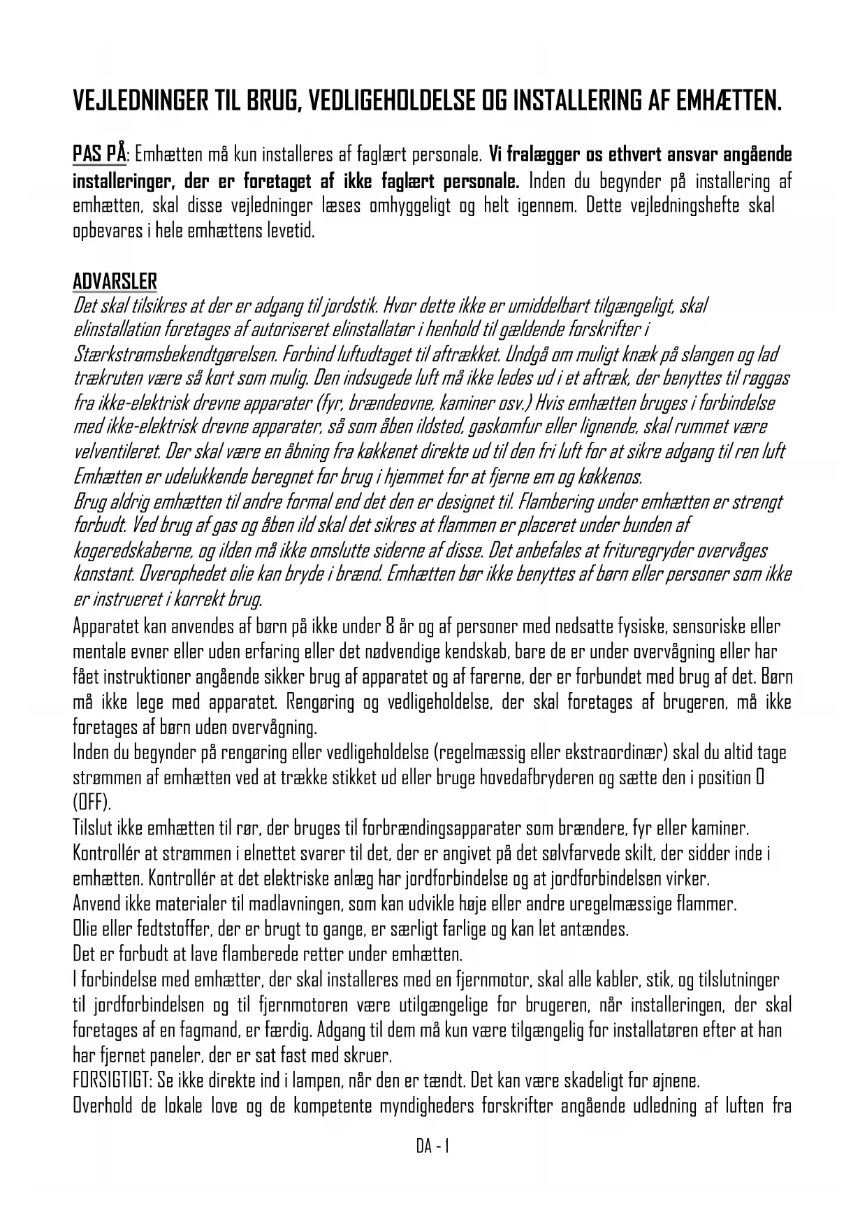 FRDA - 1 VEJLEDNINGER TIL BRUG, VEDLIGEHOLDELSE OG INSTALLERING AF EMHÆTTEN. PAS PÅ: Emhætten må kun installeres af faglært personale. Vi fralægger os ethvert ansvar angående installeringer, der er foretaget af ikke faglært personale. Inden du begynder på installering af emhætten, skal disse vejledninger læses omhyggeligt og helt igennem. Dette vejledningshefte skal opbevares i hele emhættens levetid. ADVARSLER Det skal tilsikres at der er adgang til jordstik. Hvor dette ikke er umiddelbart tilgængeligt, skal elinstallation foretages af autoriseret elinstallatør i henhold til gældende forskrifter i Stærkstrømsbekendtgørelsen. Forbind luftudtaget til aftrækket. Undgå om muligt knæk på slangen og lad trækruten være så kort som mulig. Den indsugede luft må ikke ledes ud i et aftræk, der benyttes til røggas fra ikke-elektrisk drevne apparater (fyr, brændeovne, kaminer osv.) Hvis emhætten bruges i forbindelse med ikke-elektrisk drevne apparater, så som åben ildsted, gaskomfur eller lignende, skal rummet være velventileret. Der skal være en åbning fra køkkenet direkte ud til den fri luft for at sikre adgang til ren luft Emhætten er udelukkende beregnet for brug i hjemmet for at fjerne em og køkkenos. Brug aldrig emhætten til andre formal end det den er designet til. Flambering under emhætten er strengt forbudt. Ved brug af gas og åben ild skal det sikres at flammen er placeret under bunden af kogeredskaberne, og ilden må ikke omslutte siderne af disse. Det anbefales at frituregryder overvåges konstant. Overophedet olie kan bryde i brænd. Emhætten bør ikke benyttes af børn eller personer som ikke er instrueret i korrekt brug. Apparatet kan anvendes af børn på ikke under 8 år og af personer med nedsatte fysiske, sensoriske eller mentale evner eller uden erfaring eller det nødvendige kendskab, bare de er under overvågning eller har fået instruktioner angående sikker brug af apparatet og af farerne, der er forbundet med brug af det. Børn må ikke lege med apparatet. Rengøring og vedligeholdelse, der skal foretages af brugeren, må ikke foretages af børn uden overvågning. Inden du begynder på rengøring eller vedligeholdelse (regelmæssig eller ekstraordinær) skal du altid tage strømmen af emhætten ved at trække stikket ud eller bruge hovedafbryderen og sætte den i position 0 (OFF). Tilslut ikke emhætten til rør, der bruges til forbrændingsapparater som brændere, fyr eller kaminer. Kontrollér at strømmen i elnettet svarer til det, der er angivet på det sølvfarvede skilt, der sidder inde i emhætten. Kontrollér at det elektriske anlæg har jordforbindelse og at jordforbindelsen virker. Anvend ikke materialer til madlavningen, som kan udvikle høje eller andre uregelmæssige flammer. Olie eller fedtstoffer, der er brugt to gange, er særligt farlige og kan let antændes. Det er forbudt at lave flamberede retter under emhætten. I forbindelse med emhætter, der skal installeres med en fjernmotor, skal alle kabler, stik, og tilslutninger til jordforbindelsen og til fjernmotoren være utilgængelige for brugeren, når installeringen, der skal foretages af en fagmand, er færdig. Adgang til dem må kun være tilgængelig for installatøren efter at han har fjernet paneler, der er sat fast med skruer. FORSIGTIGT: Se ikke direkte ind i lampen, når den er tændt. Det kan være skadeligt for øjnene. Overhold de lokale love og de kompetente myndigheders forskrifter angående udledning af luften fraDA - 2 emhættens udsugning. Vi minder om at hvis man ikke overholder og udfører alle de indgreb til vedligeholdelse og rengøring, der er angivet i dette hefte, er der alvorlig fare for brand. PAS PÅ: De dele, man kan komme i berøring med, kan blive varme når emhætten bruges med madlavningsapparater. INSTALLERING Den mindste sikkerhedsafstand fra emhættens nederste plan til kogeplanet skal være på 65 cm; mindre afstande skal udelukkende autoriseres af fabrikanten (jf. installeringstegninger). Ved filtrerende funktion, dvs. når luften sendes i cirkulation igen, skal man anvende kulfiltre (jf. paragraf KULFILTRE).