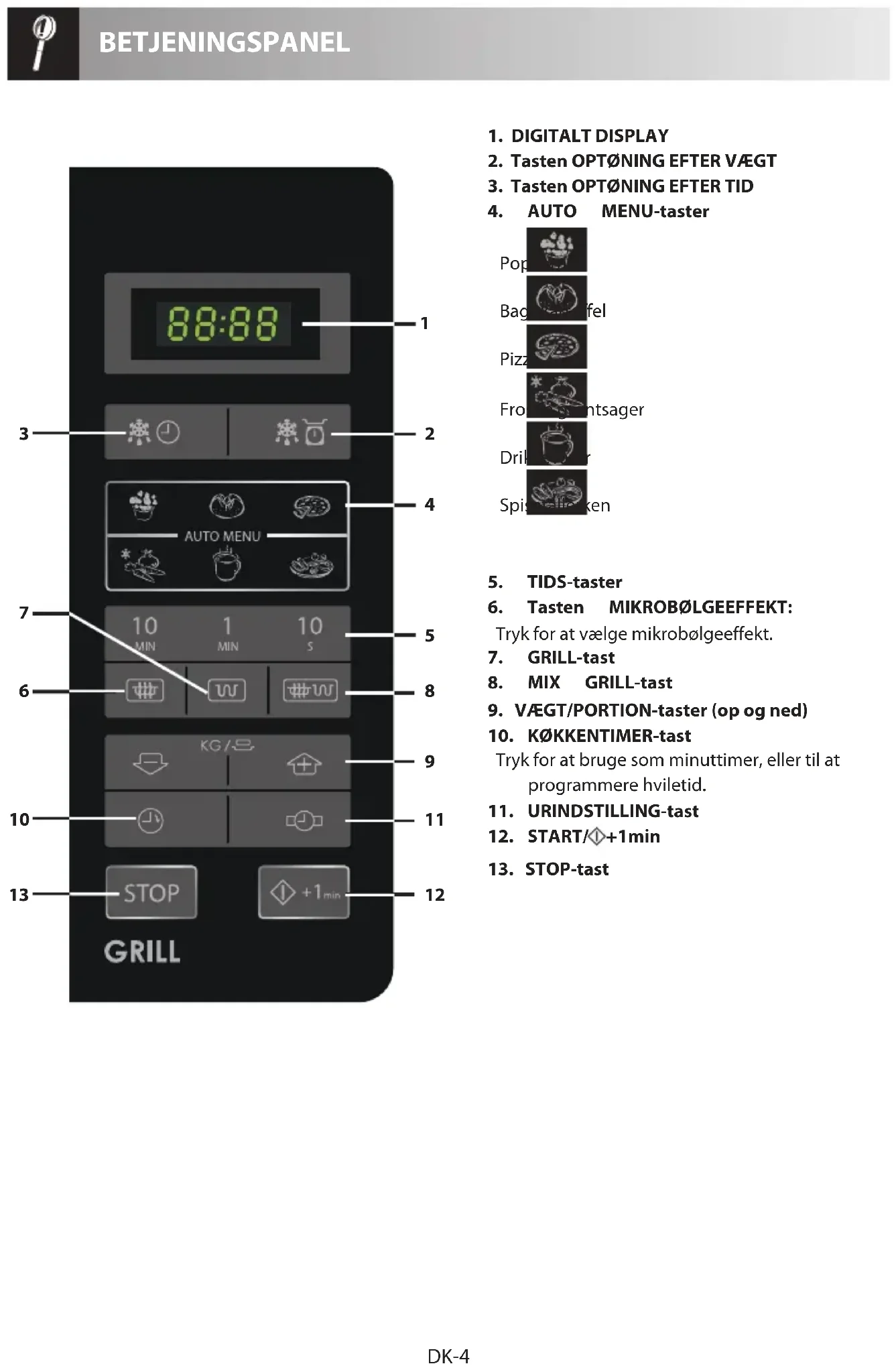 - Madvarer, der vejer mere eller mindre end den vægt/mængde, der er angivet i AUTO MENU-oversigten på side DK- 3, skal tilberedes ved manuel betjening.2DK-23 DANSK AUTO MENU-OVERSIGT Auto Menu VÆGT/ PORTION / REDSKABER Fremgangsmåde Popcorn 0,05 kg, 0,1 kg Placér popcornposen direkte på drejetallerkenen (Se noten nedenfor: ‘Vigtige oplysninger om mikrobølgepopcornsfunktion’) Bagt karto el 1, 2, 3 karto er (stykker) 1 karto el = ca. 0,23 kg (starttemp. 20° C) Brug karto er med omtrent samme størrelse på ca. 230 g. Prik hul ere steder i hver karto el og stil dem mod kanten af drejetallerkenen. Vend dem og omarranger dem halvvejs gennem tilberedningen. Lad dem stå i 3 - 5 minutter før servering. Afkølet pizza 0,1 kg, 0,2 kg, 0,4 kg (starttemp. 5°C) Tallerken Placér pizzaen på en tallerken midt på drejetallerkenen. Tildæk ikke. Frosne grøntsager, f.eks. rosenkål, grønne bønner, ærter, blandede grøntsager, broccoli 0,15 kg, 0,35 kg, 0,5 kg (starttemp. -18°C) Skål og låg Læg grøntsagerne i en egnet beholder. Tilsæt 1spsk. vand pr. 100 g grøntsager, tildæk fadet og læg det drejetallerkenen. Omrør halvvejs gennem tilberedningen og efter tilberedningen. Drikkevarer (120 ml/ kop) 1, 2, 3 (starttemp. 5°C) Kop Placér koppen/kopperne på drejetallerkenen og omrør efter opvarmningen. Spisetallerken 0,25 kg, 0,35 kg, 0,5 kg (starttemp. 5°C) Tallerken Placér tallerkenen midt på drejetallerkenen. Tildæk ikke. Omrør efter tilberedning. Bemærkninger:
