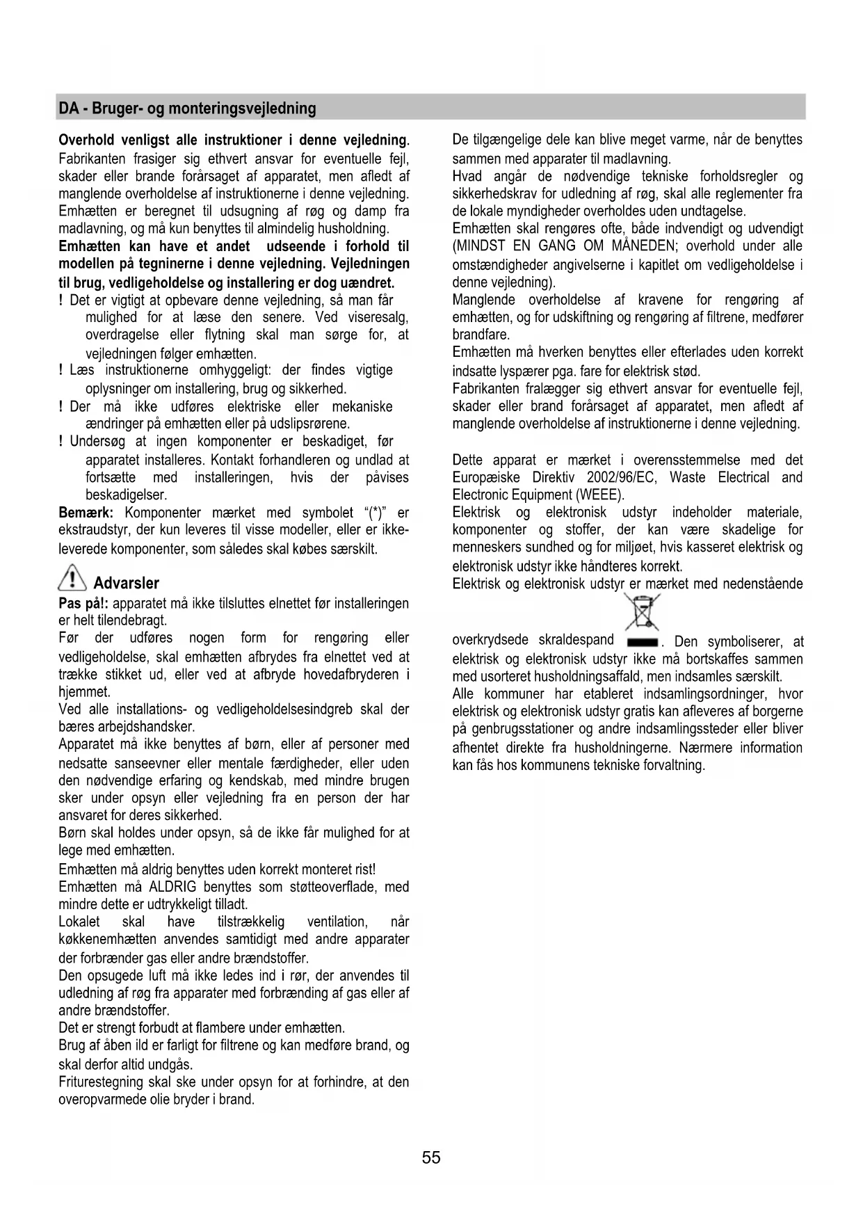 Dersom belysningen ikke skulle virke, kontroller at lyspærene er satt korrekt på plass før du henvender deg til teknisk assistanse. - Modell med LED pærer Ventilatoren er utstyrt med et belysningssystem basert på LED-teknologi. LED-lysene garanterer optimal belysning, har opptil 10 ganger lengre varighet enn tradisjonelle lyspærer og tillater en strømsparing på 90 %. Henvend deg til teknisk service når LED-pærene skal skiftes ut.55 DA - Bruger- og monteringsvejledning Overhold venligst alle instruktioner i denne vejledning. Fabrikanten frasiger sig ethvert ansvar for eventuelle fejl, skader eller brande forårsaget af apparatet, men afledt af manglende overholdelse af instruktionerne i denne vejledning. Emhætten er beregnet til udsugning af røg og damp fra madlavning, og må kun benyttes til almindelig husholdning. Emhætten kan have et andet udseende i forhold til modellen på tegninerne i denne vejledning. Vejledningen til brug, vedligeholdelse og installering er dog uændret. ! Det er vigtigt at opbevare denne vejledning, så man får mulighed for at læse den senere. Ved viseresalg, overdragelse eller flytning skal man sørge for, at vejledningen følger emhætten. ! Læs instruktionerne omhyggeligt: der findes vigtige oplysninger om installering, brug og sikkerhed. ! Der må ikke udføres elektriske eller mekaniske ændringer på emhætten eller på udslipsrørene. ! Undersøg at ingen komponenter er beskadiget, før apparatet installeres. Kontakt forhandleren og undlad at fortsætte med installeringen, hvis der påvises beskadigelser. Bemærk: Komponenter mærket med symbolet “(*)” er ekstraudstyr, der kun leveres til visse modeller, eller er ikke- leverede komponenter, som således skal købes særskilt. Advarsler Pas på!: apparatet må ikke tilsluttes elnettet før installeringen er helt tilendebragt. Før der udføres nogen form for rengøring eller vedligeholdelse, skal emhætten afbrydes fra elnettet ved at trække stikket ud, eller ved at afbryde hovedafbryderen i hjemmet. Ved alle installations- og vedligeholdelsesindgreb skal der bæres arbejdshandsker. Apparatet må ikke benyttes af børn, eller af personer med nedsatte sanseevner eller mentale færdigheder, eller uden den nødvendige erfaring og kendskab, med mindre brugen sker under opsyn eller vejledning fra en person der har ansvaret for deres sikkerhed. Børn skal holdes under opsyn, så de ikke får mulighed for at lege med emhætten. Emhætten må aldrig benyttes uden korrekt monteret rist! Emhætten må ALDRIG benyttes som støtteoverflade, med mindre dette er udtrykkeligt tilladt. Lokalet skal have tilstrækkelig ventilation, når køkkenemhætten anvendes samtidigt med andre apparater der forbrænder gas eller andre brændstoffer. Den opsugede luft må ikke ledes ind i rør, der anvendes til udledning af røg fra apparater med forbrænding af gas eller af andre brændstoffer. Det er strengt forbudt at flambere under emhætten. Brug af åben ild er farligt for filtrene og kan medføre brand, og skal derfor altid undgås. Friturestegning skal ske under opsyn for at forhindre, at den overopvarmede olie bryder i brand. De tilgængelige dele kan blive meget varme, når de benyttes sammen med apparater til madlavning. Hvad angår de nødvendige tekniske forholdsregler og sikkerhedskrav for udledning af røg, skal alle reglementer fra de lokale myndigheder overholdes uden undtagelse. Emhætten skal rengøres ofte, både indvendigt og udvendigt (MINDST EN GANG OM MÅNEDEN; overhold under alle omstændigheder angivelserne i kapitlet om vedligeholdelse i denne vejledning). Manglende overholdelse af kravene for rengøring af emhætten, og for udskiftning og rengøring af filtrene, medfører brandfare. Emhætten må hverken benyttes eller efterlades uden korrekt indsatte lyspærer pga. fare for elektrisk stød. Fabrikanten fralægger sig ethvert ansvar for eventuelle fejl, skader eller brand forårsaget af apparatet, men afledt af manglende overholdelse af instruktionerne i denne vejledning. Dette apparat er mærket i overensstemmelse med det Europæiske Direktiv 2002/96/EC, Waste Electrical and Electronic Equipment (WEEE). Elektrisk og elektronisk udstyr indeholder materiale, komponenter og stoffer, der kan være skadelige for menneskers sundhed og for miljøet, hvis kasseret elektrisk og elektronisk udstyr ikke håndteres korrekt. Elektrisk og elektronisk udstyr er mærket med nedenstående overkrydsede skraldespand . Den symboliserer, at elektrisk og elektronisk udstyr ikke må bortskaffes sammen med usorteret husholdningsaffald, men indsamles særskilt. Alle kommuner har etableret indsamlingsordninger, hvor elektrisk og elektronisk udstyr gratis kan afleveres af borgerne på genbrugsstationer og andre indsamlingssteder eller bliver afhentet direkte fra husholdningerne. Nærmere information kan fås hos kommunens tekniske forvaltning.56 Brug Emhætten er udviklet til brug i den sugende udgave med ekstern udledning eller i den filtrerende udgave med intern recirkulation. Sugende udgave Dampen ledes udenfor vha. et aftræksrør fastgjort til samleflangen. Aftræksrørets diameter skal svare til diameteren på forbindelsesringen. Obs! Udledningsrøret leveres ikke, og skal købes. På den vandrette del skal røret have en let stigning (cirka 10°) for at lette bortledning af luften udenfor lokalet. Hvis emhætten er udstyret med kulfiltre, skal disse filtre fjernes. Tilslut emhætten til aftræksrør og aftrækshullet i væggen, som skal have en diameter, der passer til luftudsugningen (studsflange). Hvis rør og hul har en mindre diameter, forringes udsugningskapaciteten og støjen øges betydeligt. Producenten fralægger sig ethvert ansvar i forbindelse hermed. ! Benyt et rør, der er så kort som muligt. ! Benyt et rør, der har så få kurver som muligt (max. vinkel på kurven: 90°). ! Undgå drastiske ændringer i rørets tværsnit. ! Benyt et rør med så glat en inderside som muligt. ! Rørets materi