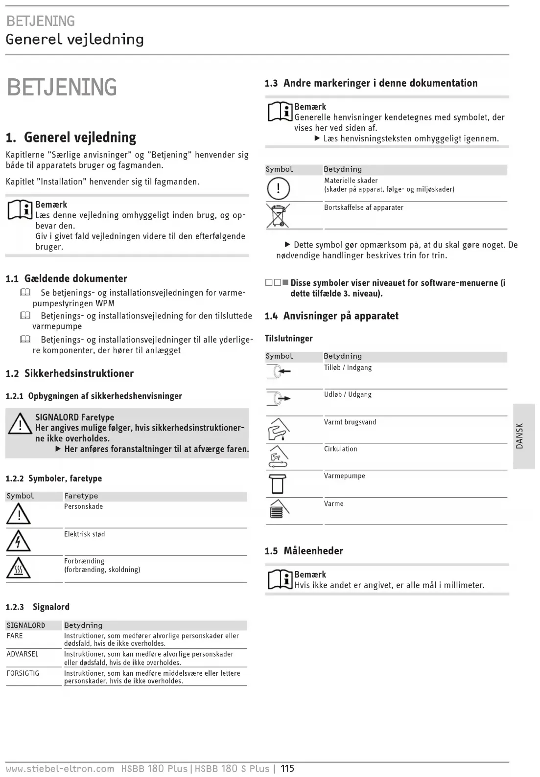 Kapitlerne ”Særlige anvisninger” og ”Betjening” henvender sig både til apparatets bruger og fagmanden.Kapitlet ”Installation” henvender sig til fagmanden. BemærkLæs denne vejledning omhyggeligt inden brug, og op-bevar den.Giv i givet fald vejledningen videre til den efterfølgende bruger.1.1 Gældende dokumenter Se betjenings- og installationsvejledningen for varme-pumpestyringen WPM Betjenings- og installationsvejledning for den tilsluttede varmepumpe Betjenings- og installationsvejledninger til alle yderlige-re komponenter, der hører til anlægget1.2 Sikkerhedsinstruktioner1.2.1 Opbygningen af sikkerhedshenvisninger