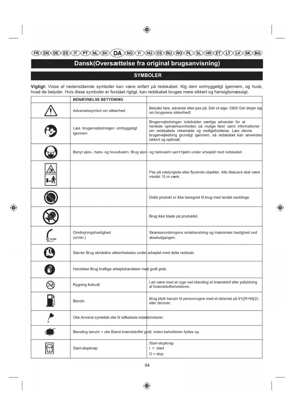 Advarselssymbol om sikkerhed Betyder fare, advarsel eller pas på. Det vil sige: OBS! Det drejer sig om brugerens sikkerhed! Læs brugervejledningen omhyggeligt igennem Brugervejledningen indeholder særlige advarsler for at henlede opmærksomheden på mulige farer samt informationer om redskabets virkemåde og vedligeholdelse. Læs denne brugervejledning grundigt igennem, så redskabet kan anvendes sikkert og optimalt. Benyt øjen-, høre- og hovedværn. Brug øjen- og høreværn samt hjelm under arbejdet med redskabet. Pas på udslyngede eller flyvende objekter. Alle tilskuere skal være mindst 15 m værk. Dette produkt er ikke beregnet til brug med tandet savklinge. Brug ikke blade på produktet. Omdrejningshastighed (o/min.) Skæreanordningens omløbsretning og maksimale hastighed ved akseludgangen. Støvler Brug skridsikre sikkerhedssko under arbejdet med dette redskab. Handsker Brug kraftige arbejdshandsker med godt greb. Rygning forbudt Lad være med at ryge ved blanding af brændstof eller påfyldning af brændstofbeholderen. Benzin Brug blyfri benzin til personvogne med et oktantal på 91([R+M]/2) eller derover. Olie Anvend syntetisk olie til luftkølede totaktsmotorer. Blanding benzin + olie Bland brændstoffet godt, inden beholderen fyldes op. Start-stopknap Start-stopknap I = start O = stop95 Dansk(Oversættelse fra original brugsanvisning) Hold hænderne på afstand af knivene. Arbejdsstilling Indstil chokerhåndetaget i chokerposition “FULL” (=fuld). Indstil chokerhåndetaget i chokerposition “HALF” (=halv). Sæt tændingskontakten i pos. “I” (=ON). Pres spædebolden ind 10 gange. Træk i starthåndtaget for at starte motoren. Pres gaslåsen og gasudløseren ind for at starte. Ventetid 10 sekunder Motoren standser, når tændingskontakten sættes på “O”. Dette redskab overholder alle lovkrav og standarder i det EU-land, hvor det er købt. EurAsian overensstemmelsesmærke. Det garanterede lydeffektniveau er 112 dB(A). De følgende ikoner og betydninger er beregnet til at forklare risikoen involveret i at anvende denne enhed.