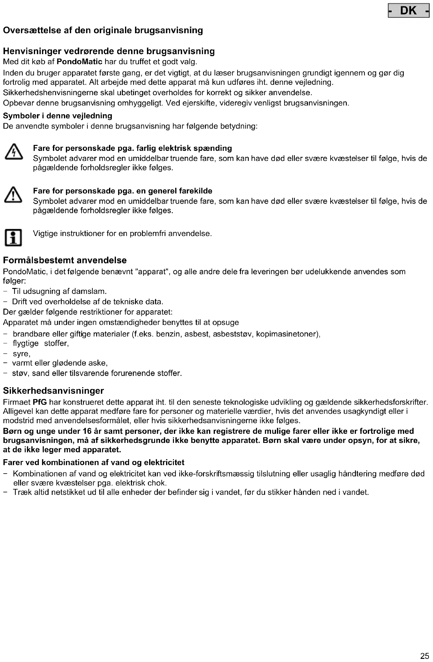 Firmaet PfG har konstruert dette apparat iht. til den seneste tekhnologiske udvikling og gaelende sikkerhedsforskrifter. Alligevel kan dette apparat medfrole fare for personer og materielle verdier, hvis det anvendes usagkyndigt erler i modstrid med anvendelsesformålet, eller hvis sikkerhedsanvisningerne ikke folges.