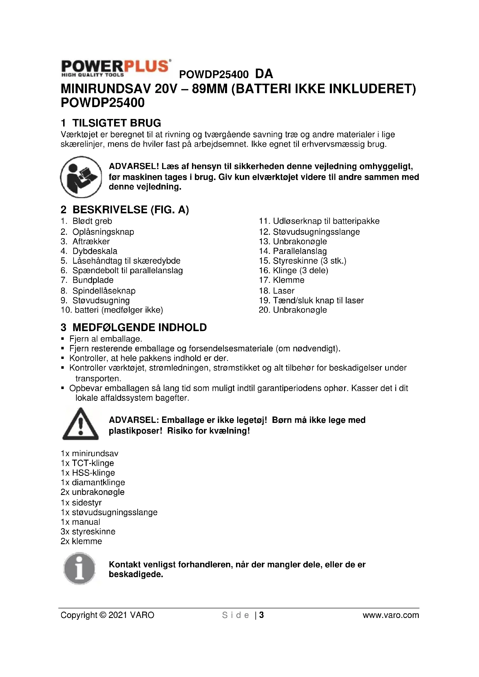 - Af denne grund er saven er ikke egnet til brug i omvendt position som fastgjort udstyr.POWDP25400 DA Copyright © 2021 VARO S i d e | 8 www.varo.com