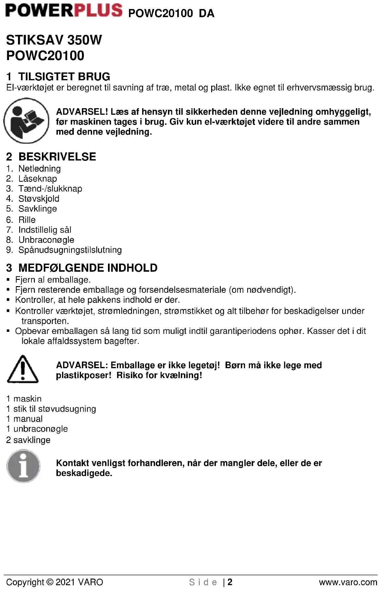 Copyright © 2021 VARO S i d e | 2 www.varo.com STIKSAV 350W POWC20100 1 TILSIGTET BRUG El-værktøjet er beregnet til savning af træ, metal og plast. Ikke egnet til erhvervsmæssig brug. ADVARSEL! Læs af hensyn til sikkerheden denne vejledning omhyggeligt, før maskinen tages i brug. Giv kun el-værktøjet videre til andre sammen med denne vejledning. 2 BESKRIVELSE