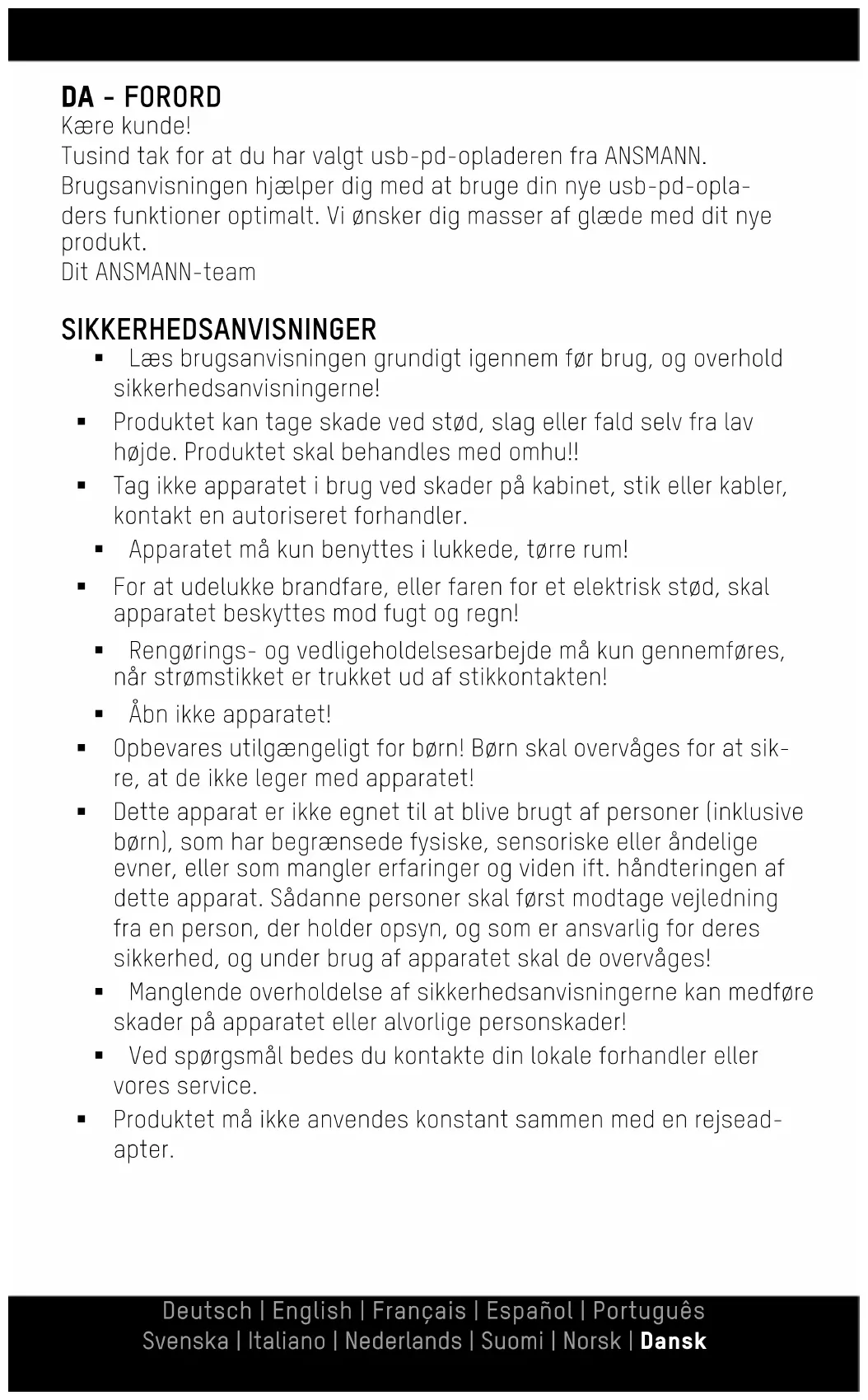 Vi gir en treårs garanti på dette produktet. Ved skader på produktet som oppstår som følge av manglende overholdelse av bruksanvisnin- gen, kan vi ikke gi noen garanti. Med forbehold om tekniske endringer. Vi overtar ikke ansvar for trykk- feil. 06/2019 Du finner våre garantivilkår online på www.ansmann.deDA - FORORD Kære kunde! Tusind tak for at du har valgt usb-pd-opladeren fra ANSMANN. Brugsanvisningen hjælper dig med at bruge din nye usb-pd-opla- ders funktioner optimalt. Vi ønsker dig masser af glæde med dit nye produkt. Dit ANSMANN-team SIKKERHEDSANVISNINGER Læs brugsanvisningen grundigt igennem før brug, og overhold sikkerhedsanvisningerne! Produktet kan tage skade ved stød, slag eller fald selv fra lav højde. Produktet skal behandles med omhu!! Tag ikke apparatet i brug ved skader på kabinet, stik eller kabler, kontakt en autoriseret forhandler. Apparatet må kun benyttes i lukkede, tørre rum! For at udelukke brandfare, eller faren for et elektrisk stød, skal apparatet beskyttes mod fugt og regn! Rengørings- og vedligeholdelsesarbejde må kun gennemføres, når strømstikket er trukket ud af stikkontakten! Åbn ikke apparatet! Opbevares utilgængeligt for børn! Børn skal overvåges for at sik- re, at de ikke leger med apparatet! Dette apparat er ikke egnet til at blive brugt af personer (inklusive børn), som har begrænsede fysiske, sensoriske eller åndelige evner, eller som mangler erfaringer og viden ift. håndteringen af dette apparat. Sådanne personer skal først modtage vejledning fra en person, der holder opsyn, og som er ansvarlig for deres sikkerhed, og under brug af apparatet skal de overvåges! Manglende overholdelse af sikkerhedsanvisningerne kan medføre skader på apparatet eller alvorlige personskader! Ved spørgsmål bedes du kontakte din lokale forhandler eller vores service. Produktet må ikke anvendes konstant sammen med en rejsead- apter. Deutsch | English | Français | Español | Português Svenska | Italiano | Nederlands | Suomi | Norsk | DanskIBRUGTAGNING Pd-egnet Pd-egnetusb-type-c Pd-egnet Hurtig opladning Høj effekt