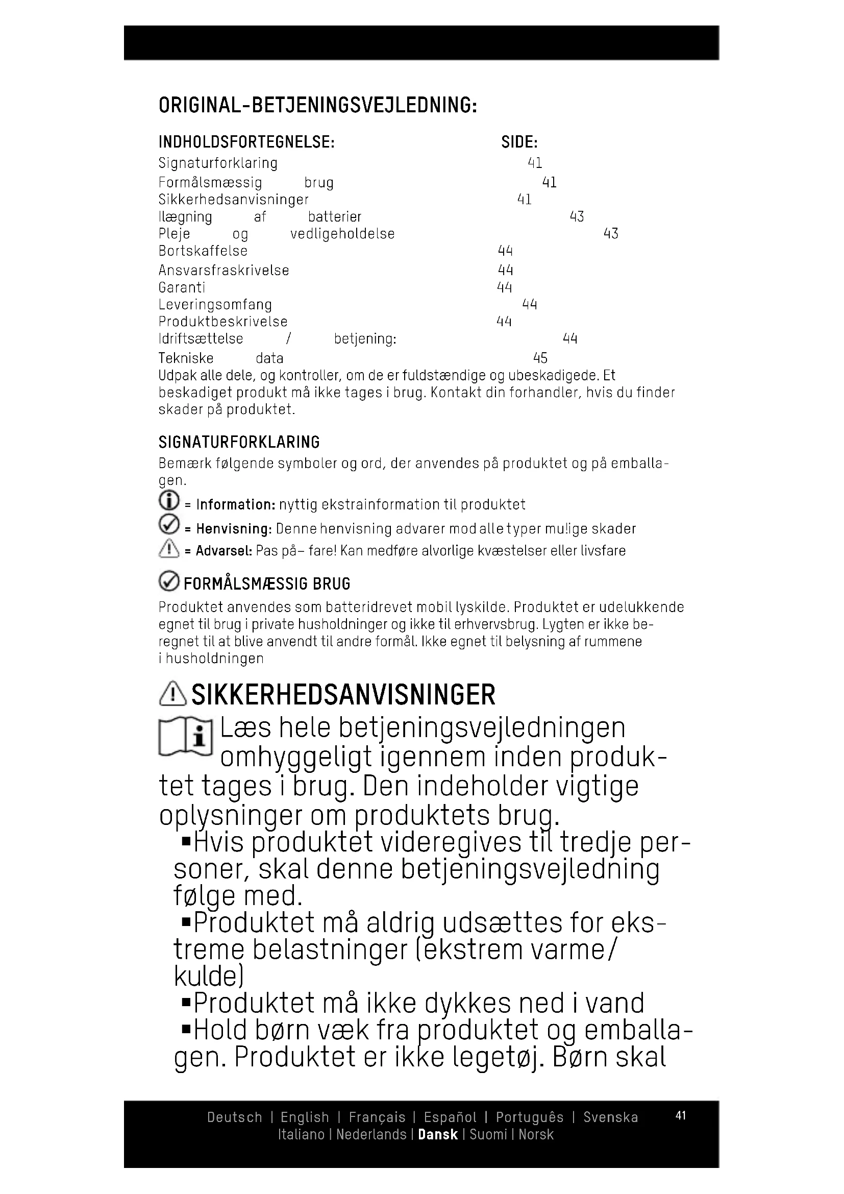 Produktet anvendes som batteridrevet mobil lyskilde. Produktet er udelukkende egnet til brug i private husholdninger og ikke til erhvervsbrug. Lygten er ikke be- regnet til at blive anvendt til andre formål. Ikke egnet til belysning af rummene i husholdningen SIKKERHEDSANVISNINGER Læs hele betjeningsvejledningen omhyggeligt igennem inden produk- tet tages i brug. Den indeholder vigtige oplysninger om produktets brug. §Hvis produktet videregives til tredje per- soner, skal denne betjeningsvejledning følge med. §Produktet må aldrig udsættes for eks- treme belastninger (ekstrem varme/ kulde) §Produktet må ikke dykkes ned i vand §Hold børn væk fra produktet og emballa- gen. Produktet er ikke legetøj. Børn skal Deutsch | English | Français | Español | Português | Svenska Italiano | Nederlands | Dansk | Suomi | Norsk42 overvåges for at sikre, at de ikke leger med apparatet. §Dette produkt er ikke egnet til at blive brugt af personer (inklusive børn), som har begrænsede fysiske, sensoriske eller åndelige evner, eller som mangler erfaring og viden ift. håndteringen af dette produkt. Sådanne personer skal først modtage vejledning fra en person, der holder opsyn, og som er ansvarlig for deres sikkerhed, og under brug af pro- duktet skal de overvåges!